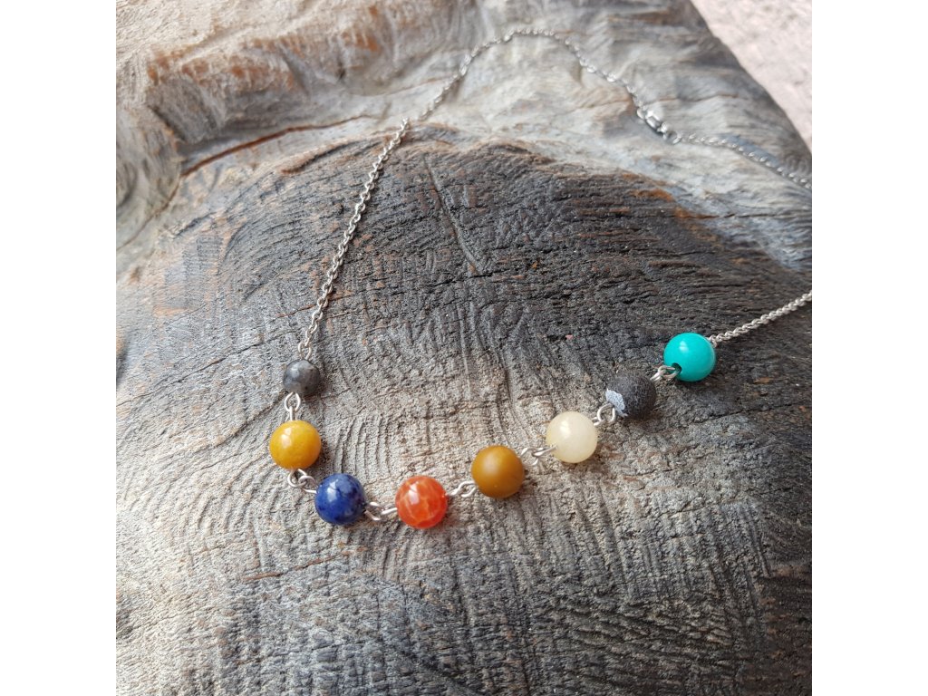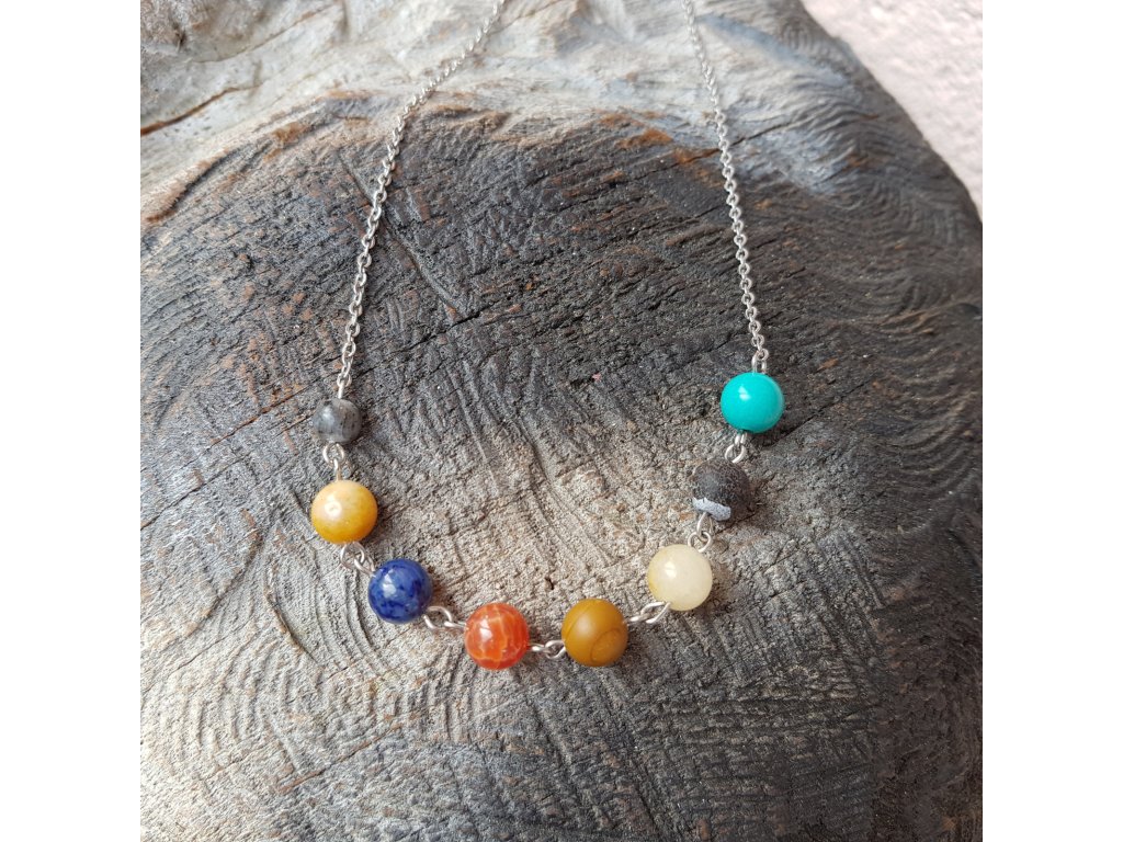Autorský náhrdelník jsme vytvořili z jemného řetízku z chirurgické oceli, v jehož středu jsou ručně naketlované kuličky tyrkysu, achátu, avanturínu, jaspisu, sodalitu a labradoritu.