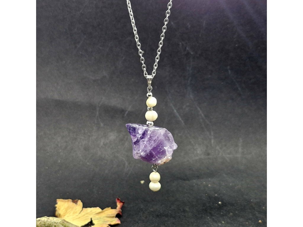 Surový valounek ametystu s krásnou strukturou jsme ozdobili sladkovodními perličkami a kuličkami z nerezové oceli.