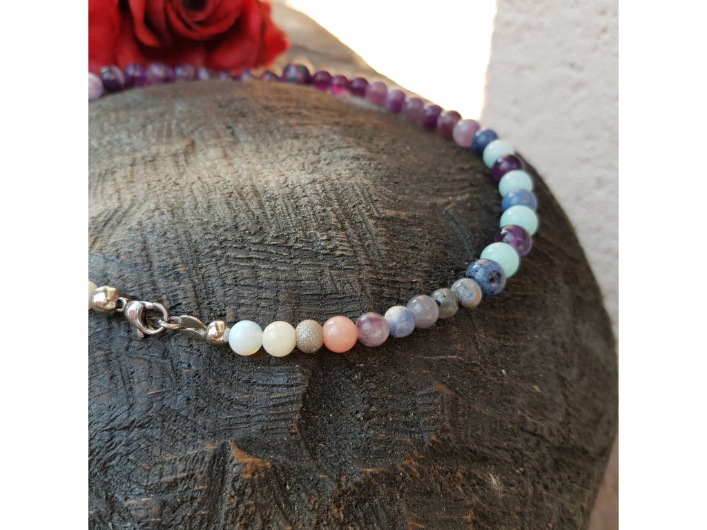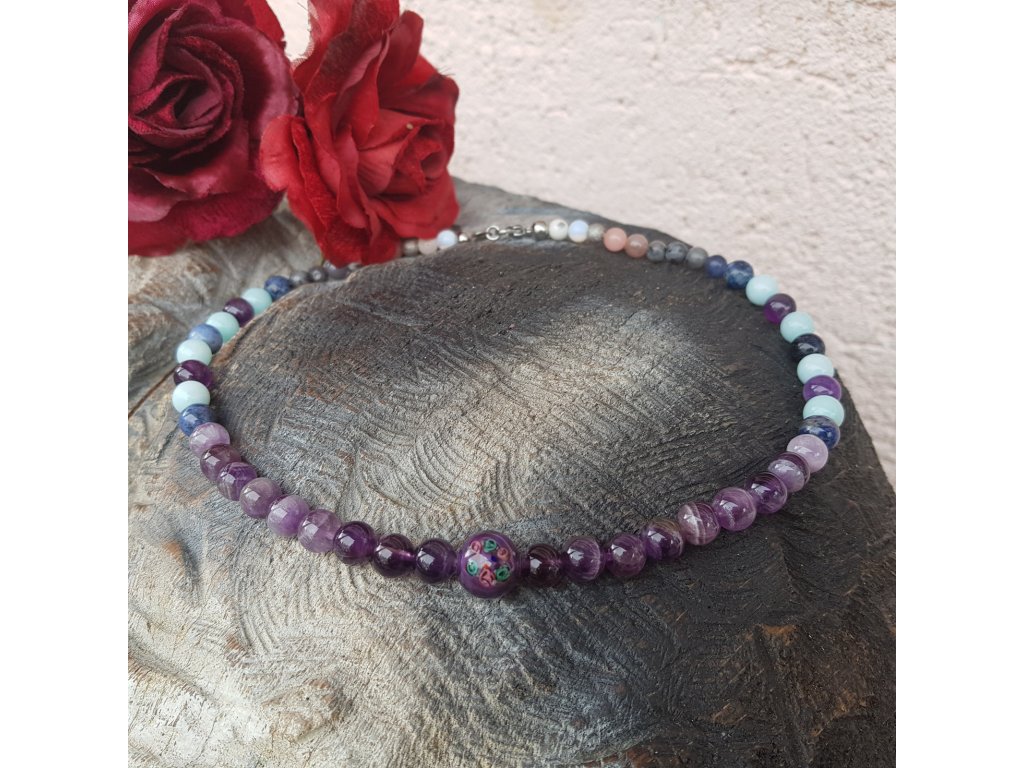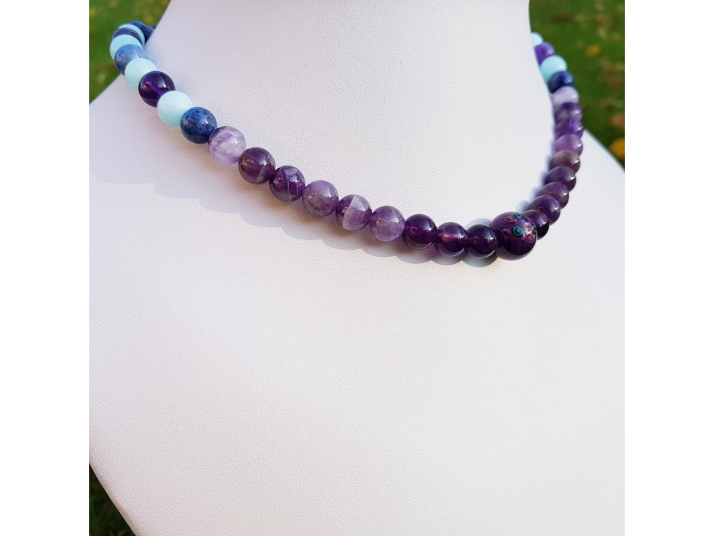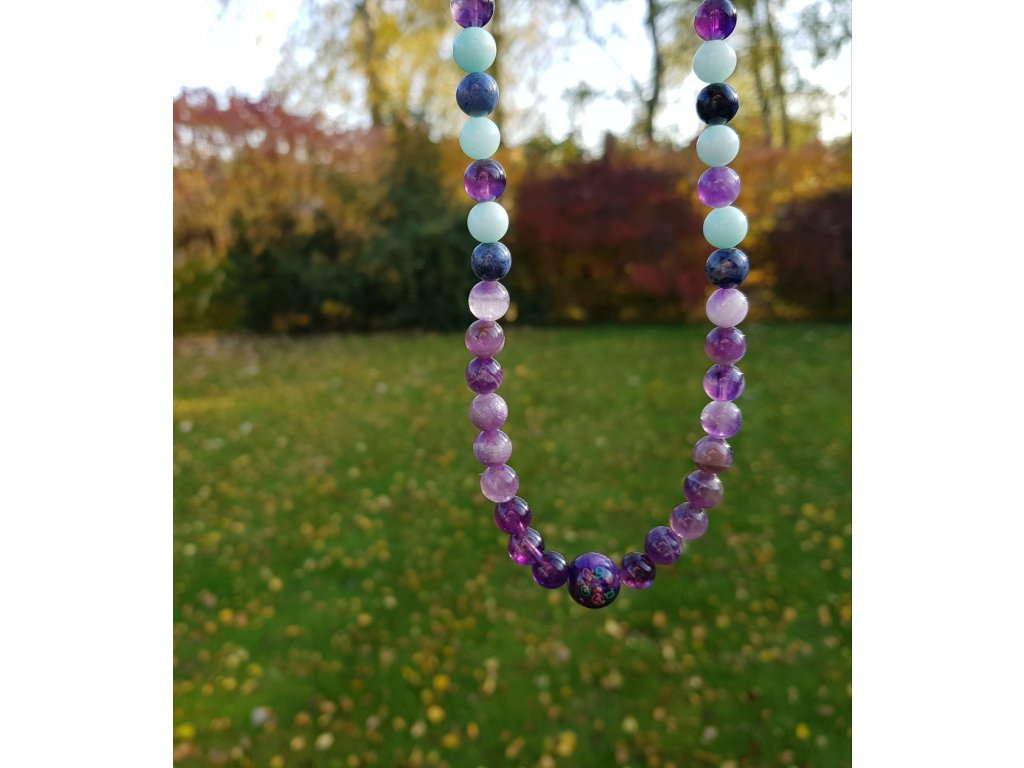 Použili jsme ametyst, jadeit, labradorit, sodalit a měsíční kámen. Dominantou je ručně vinutá perla s kvítím.