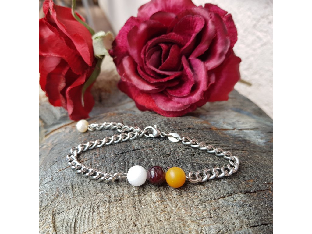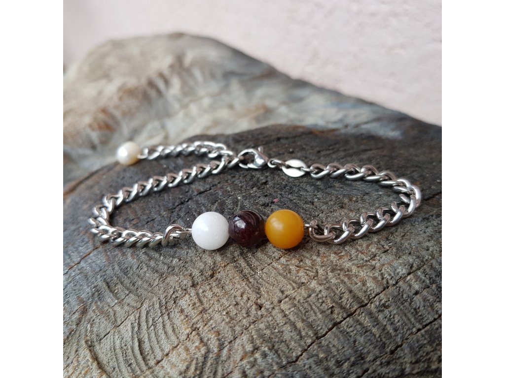 Použili jsme masivnější řetízek z kvalitní nerezové oceli, na kterém jsou napevno zakomponované kuličky přírodního avanturínu, granátu a malajského nefritu. Zapínání je na karabinku. Zakončení řetízku je zdobeno drobnou říční perlou.