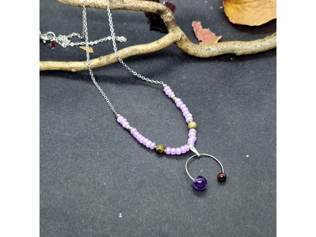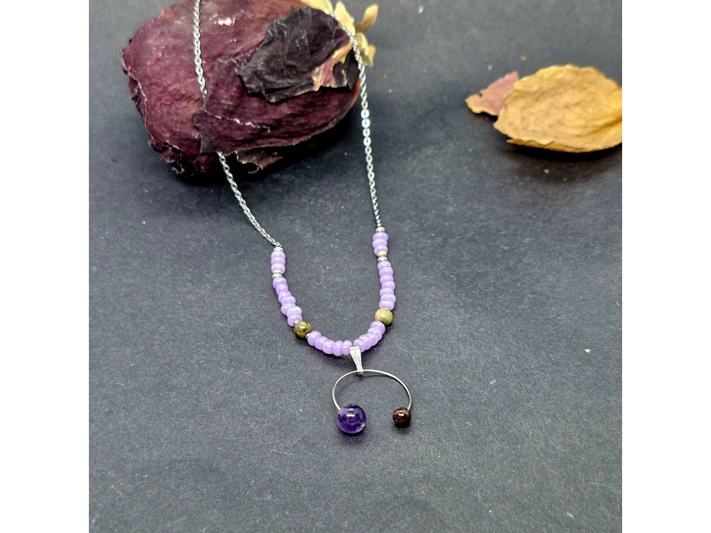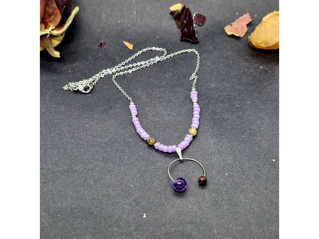 Objevte šperk, který v sobě snoubí industriální pevnost oceli a nespoutanou energii země. Základ z nerezové oceli a jemného rokajlu je doplněn korálky přírodního serpentinu, který svou zelenkavou barvou připomíná mechy a lesní tůně. Dominantou je pak autorský přívěsek, v němž se setkává vášeň granátu s klidem ametystu.
