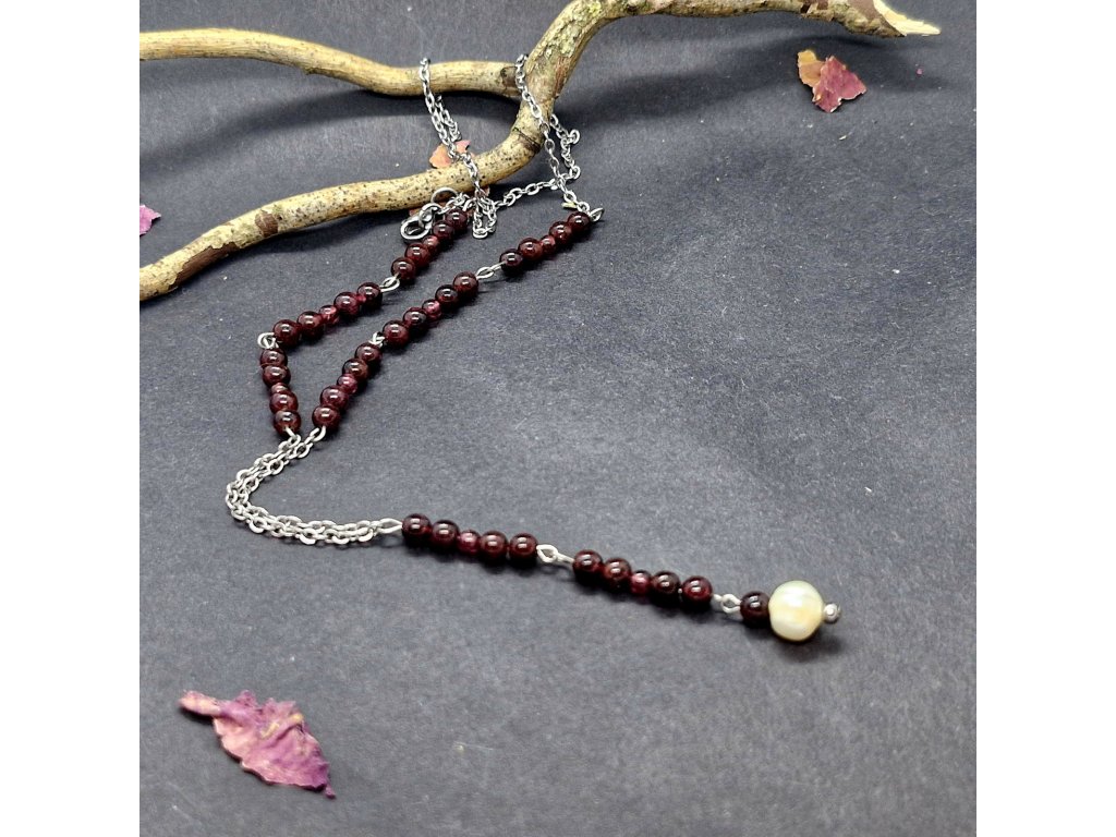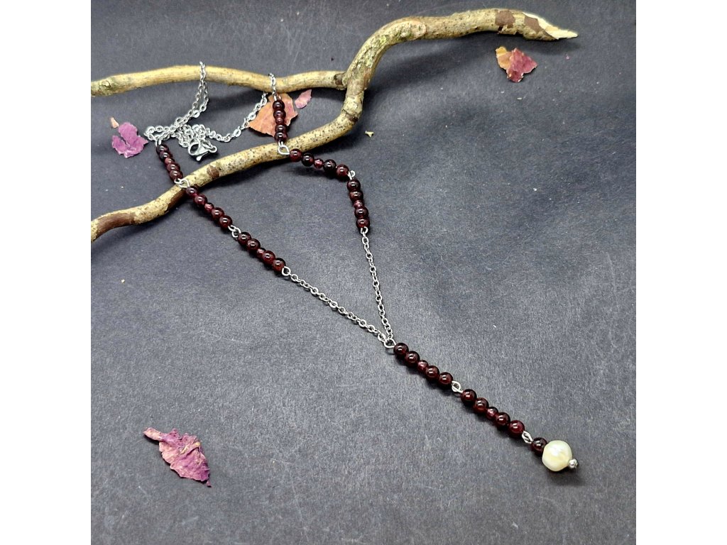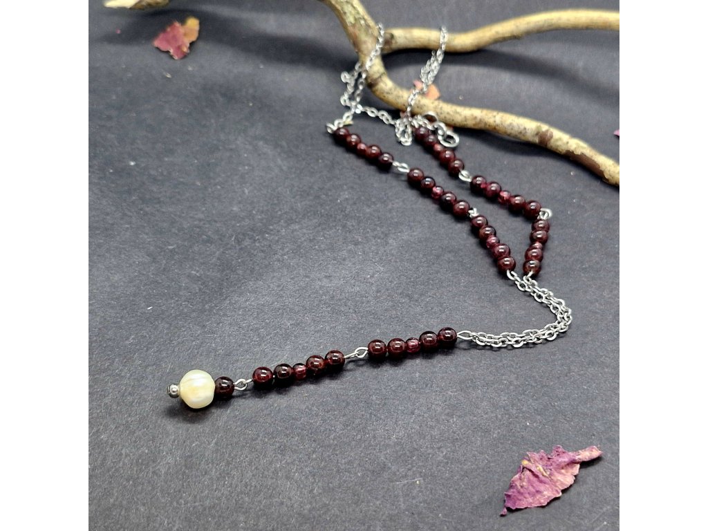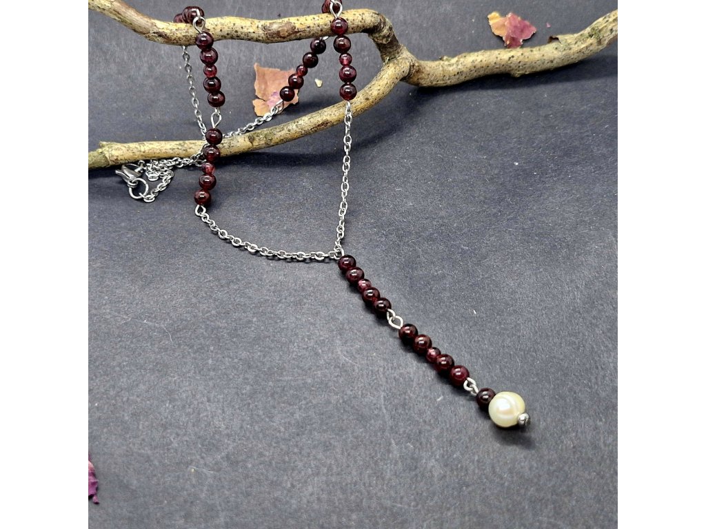 Ručně ketlované kuličky granátu na jemném řetízku. Dominantou je přívěsek s granátem a sladkovodní perlou.