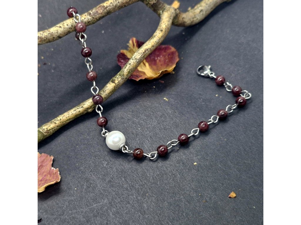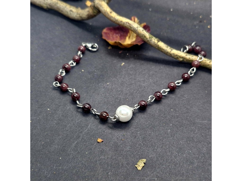 Náramek jsme vytvořili z granátu, sladkovodní perly a nerezové oceli.