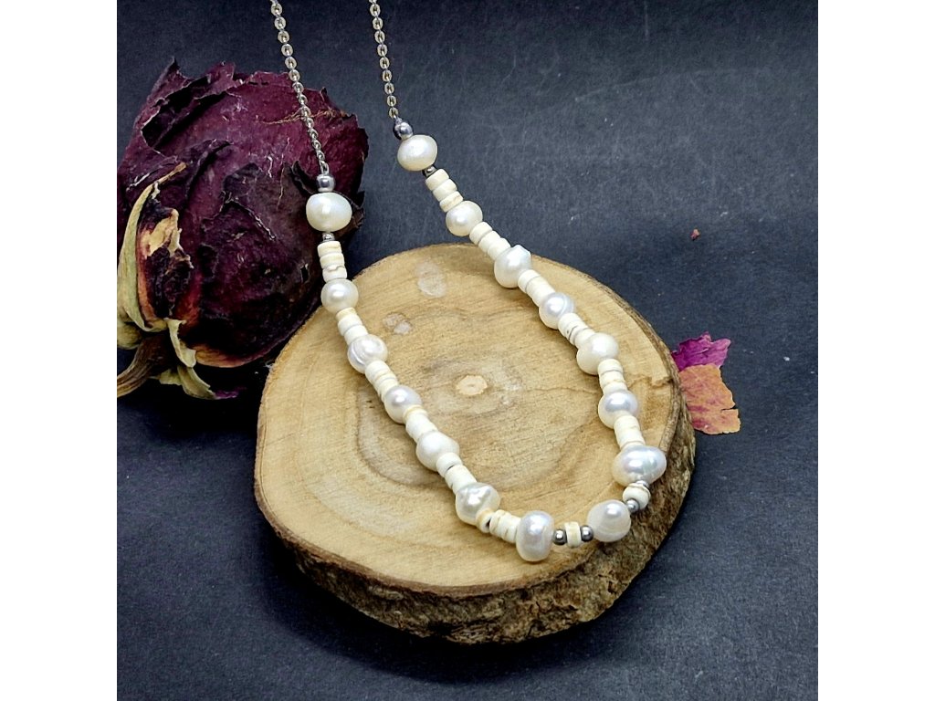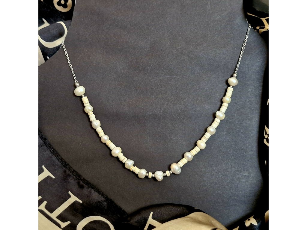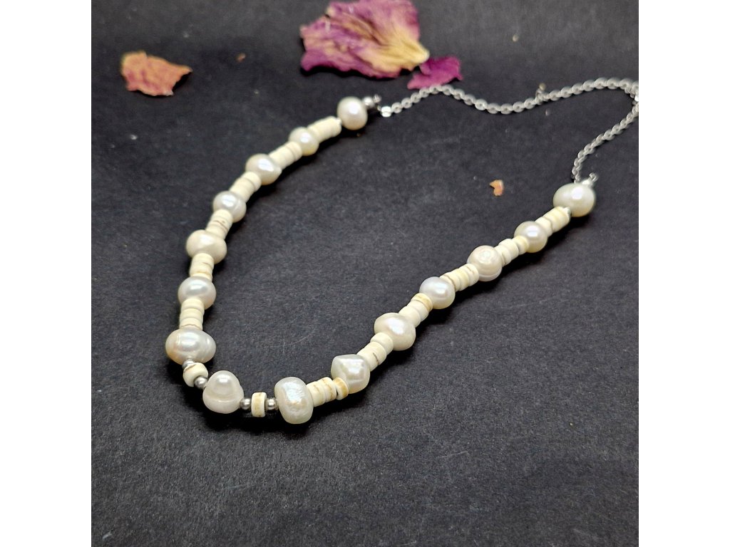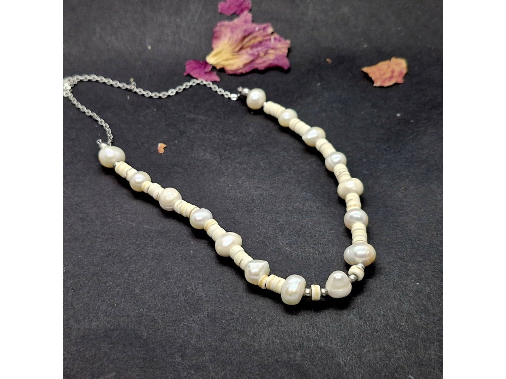 Tento elegantní a minimalistický náhrdelník spojuje uklidňující energii howlitu s jemnou krásou sladkovodních perel. Každý kámen byl pečlivě vybrán, aby vytvořil harmonický celek, který podtrhne vaši jedinečnost a dodá vašemu stylu jemný, ale výrazný prvek.