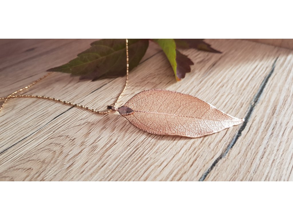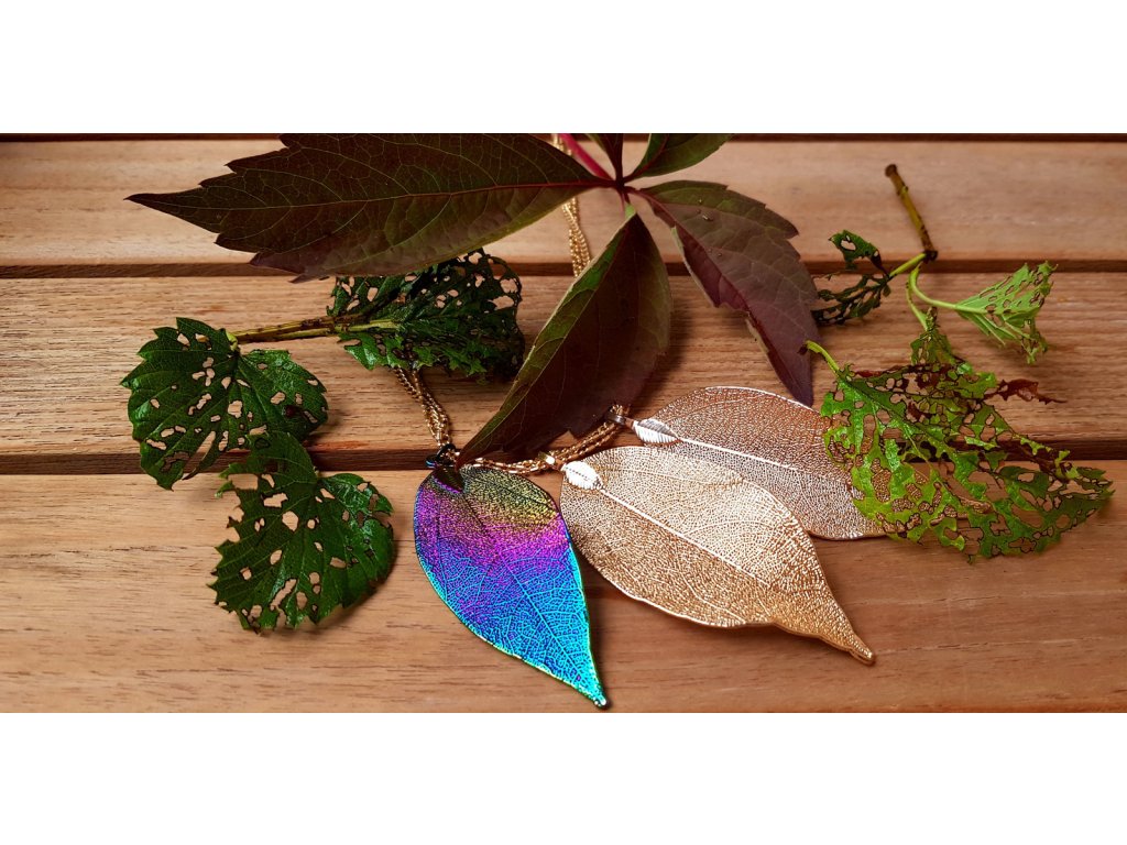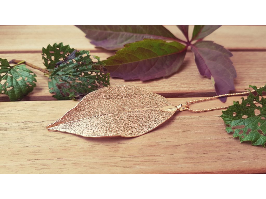 Hrátky s lístky " ve zlatém kabátku. Originální a velice ženský náhrdelník. Přívěsek je tvořen z přírodního listu, který je speciálně upraven pokovením a zavěšen na dlouhém řetízku z nerezové oceli.