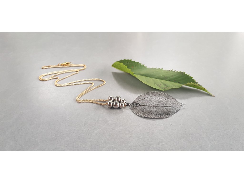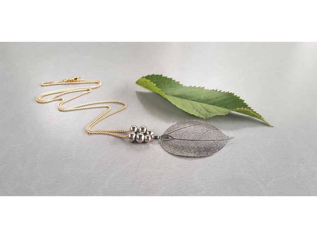 Hrátky s lístky v černozlatostříbrném kabátku. Originální a velice ženský náhrdelník. Přívěsek je tvořen z přírodního listu, který je speciálně upraven pokovením a zavěšen na dlouhém řetízku z pozlacené nerezové oceli s posuvnými ocelovými kuličkami.
