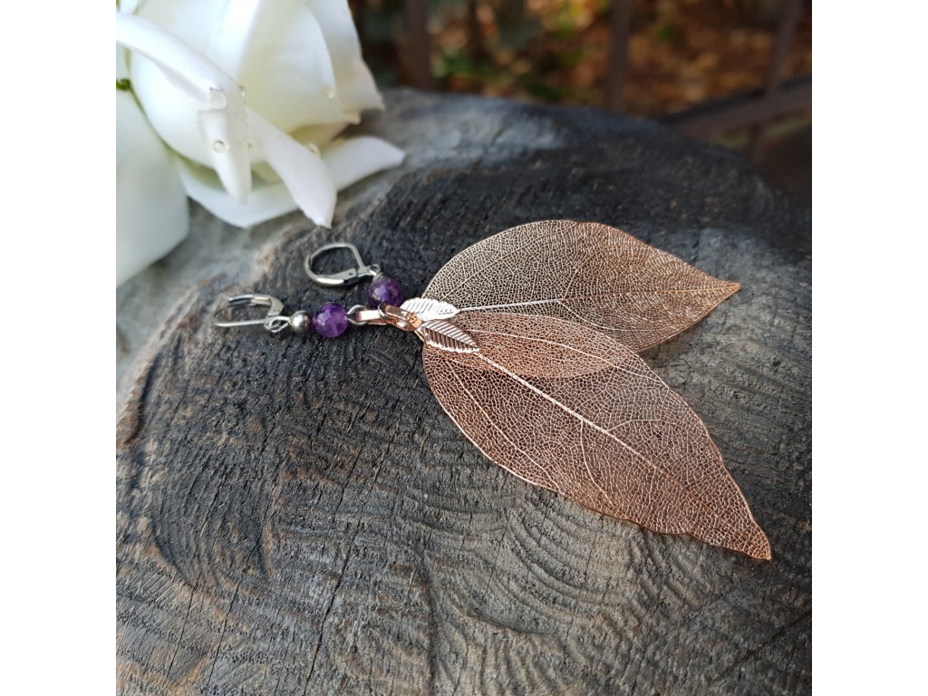 Hrátky s lístky" ve zlatostříbrném kabátku. Originální a velice ženské náušnice. Přívěsky jsou tvořeny z přírodního listu, který je speciálně upraven pokovením. Dále jsme použili kuličky ametystu o průměru 5 mm. a korálky z nerezové oceli. Mechanické zapínání je rovněž z kvalitní nerezové oceli, která nemění barvu ani tvar a je vhodná i pro alergiky.
