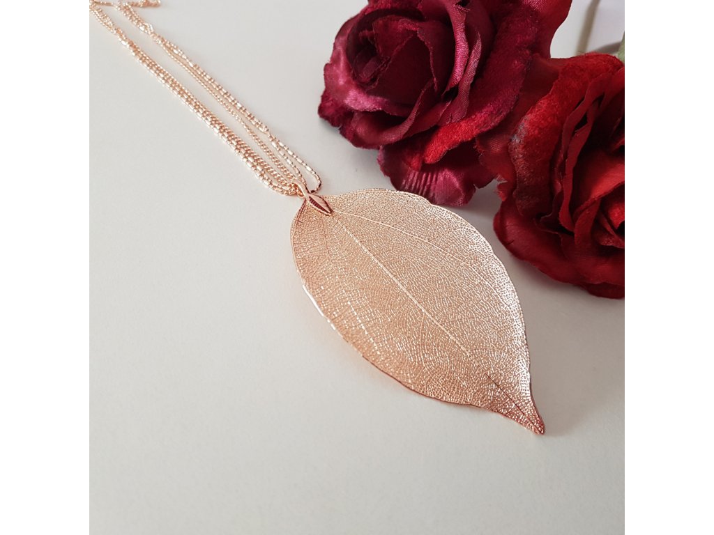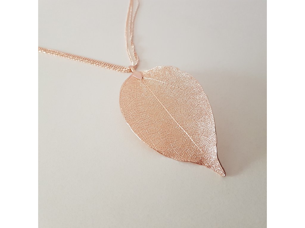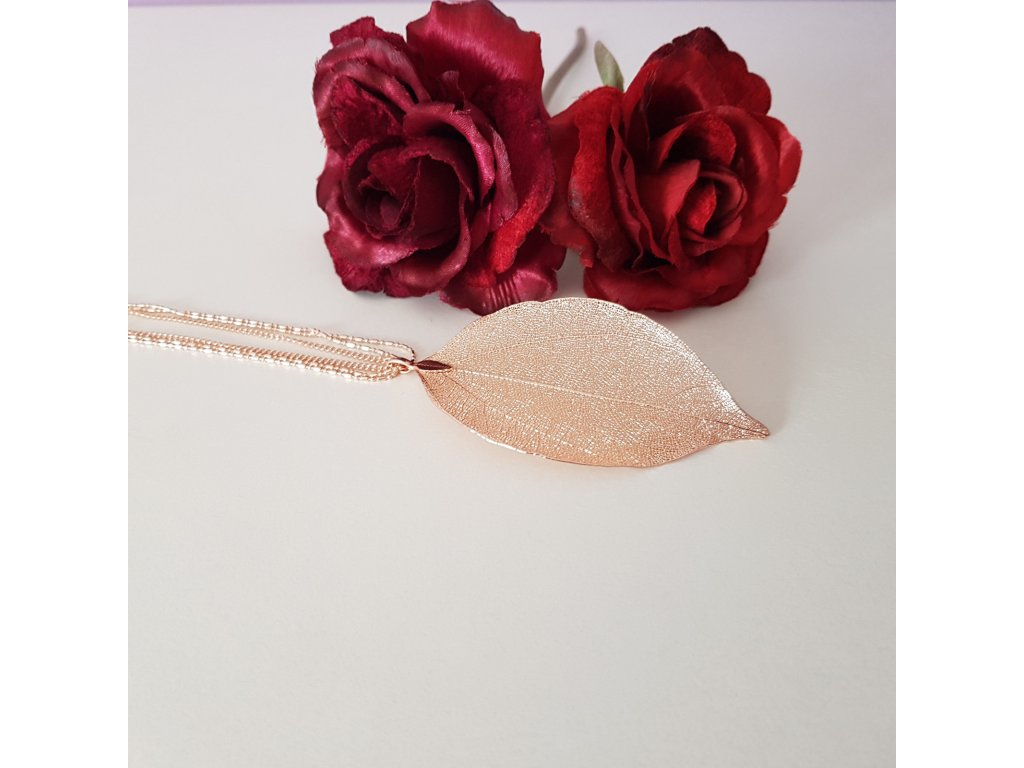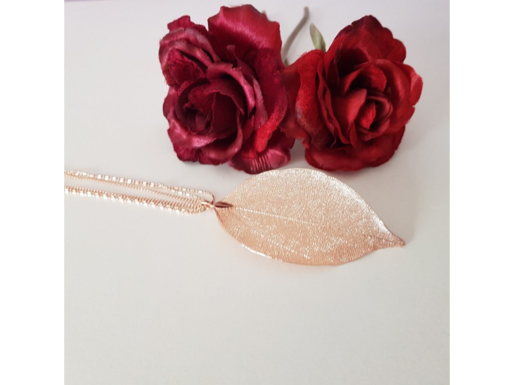 "Hrátky s lístky" ve zlatorůžovém kabátku. Originální a velice ženský náhrdelník. Přívěsek je tvořen z přírodního listu, který je speciálně upraven pokovením a zavěšen na dlouhém trojitém řetízku z nerezové oceli.