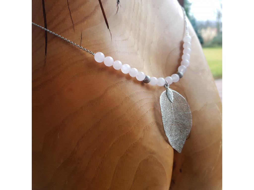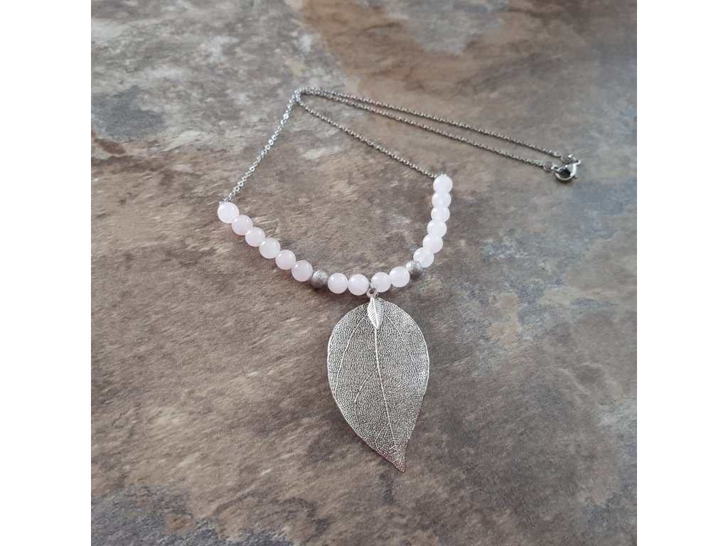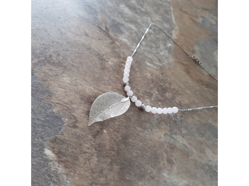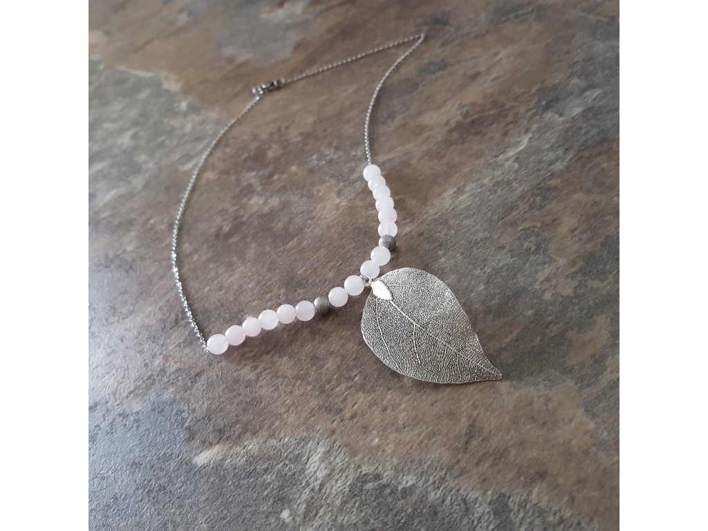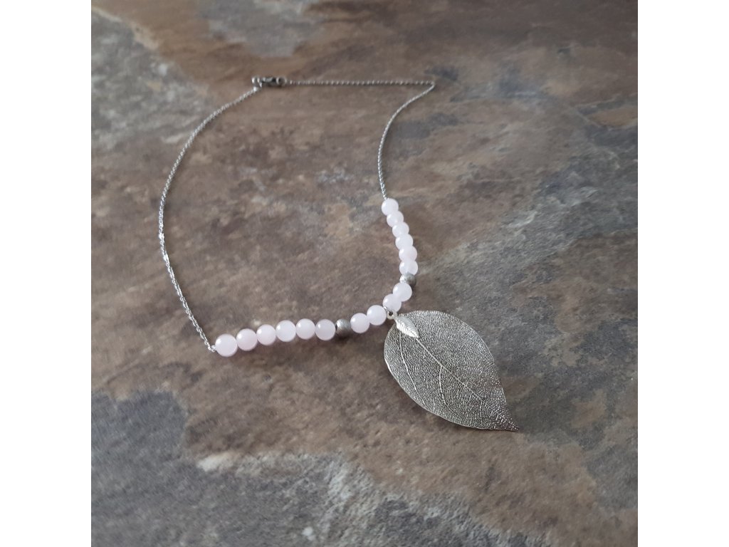 Hrátky s lístky ve stříbrném kabátku. Originální a velice ženský náhrdelník. Přívěsek je tvořen z přírodního listu, který je speciálně upraven pokovením a zavěšen na řetízku z chirurgické oceli s kuličkami růženínu.
