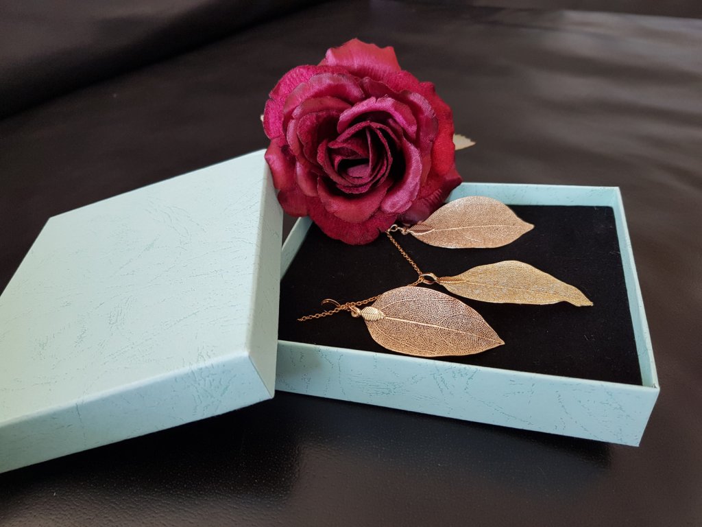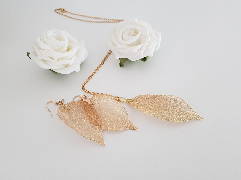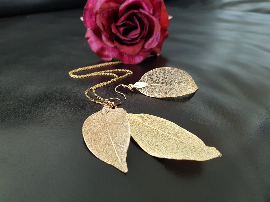 Hrátky s lístky" ve zlatém kabátku. Originální a velice ženská souprava náhrdelníku a náušnic. Přívěsky jsou tvořeny z přírodního listu, který je speciálně upraven pokovením. Řetízek a háčky náušnic jsou z nerezové oceli.