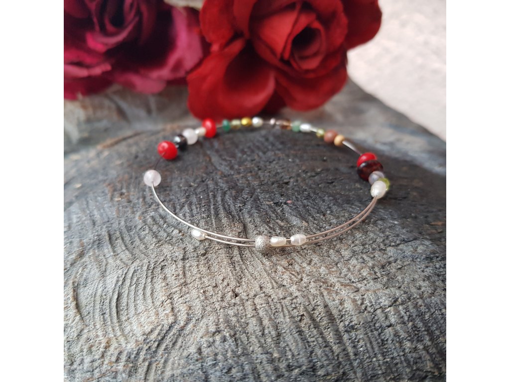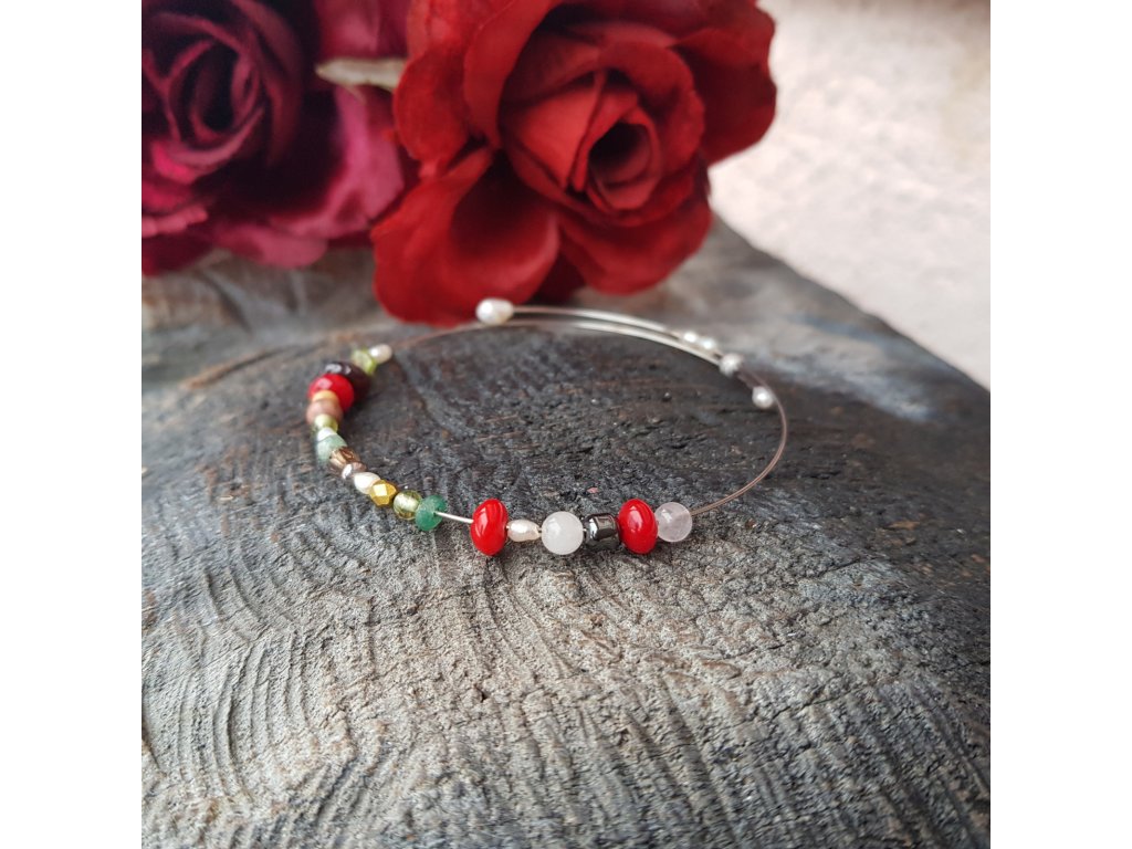 Autorský minimalistický náramek s korálem, růženínem, olivínem, rodonitem, hematitem, tromlovanými zlomky avanturínu, granátu, olivínu, broušeným sklem a říčními perličkami.