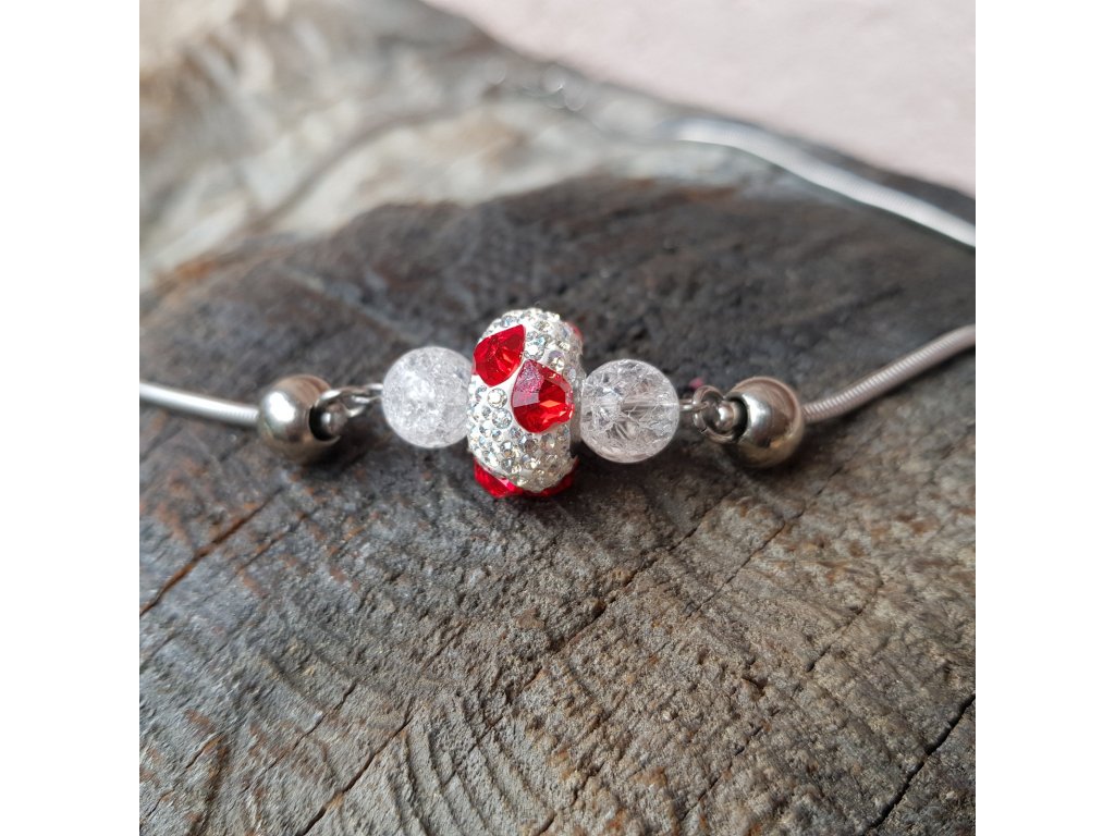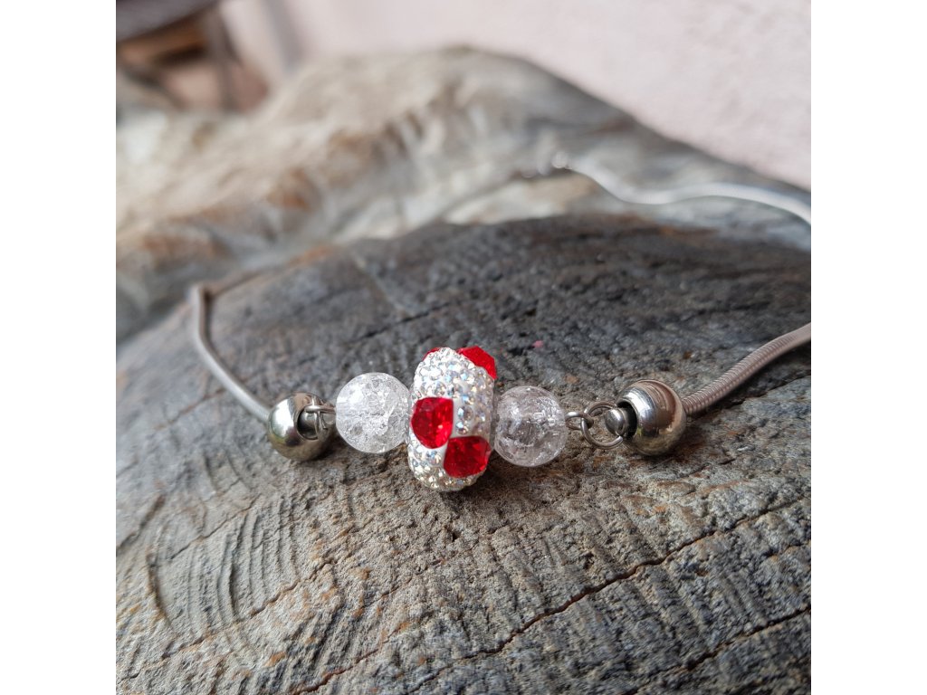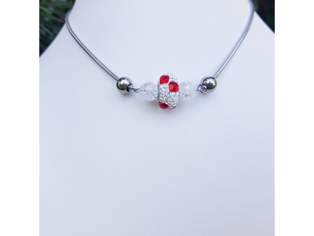 Náhrdelník jsme vytvořili z hadího řetízku z kvalitní nerezové oceli, na kterém jsou zakomponovány kuličky pravého praskaného křišťálu a korálky z nerezové oceli. Dominantou je rondelka posetá kamínky Swarovski s rudými srdíčky.