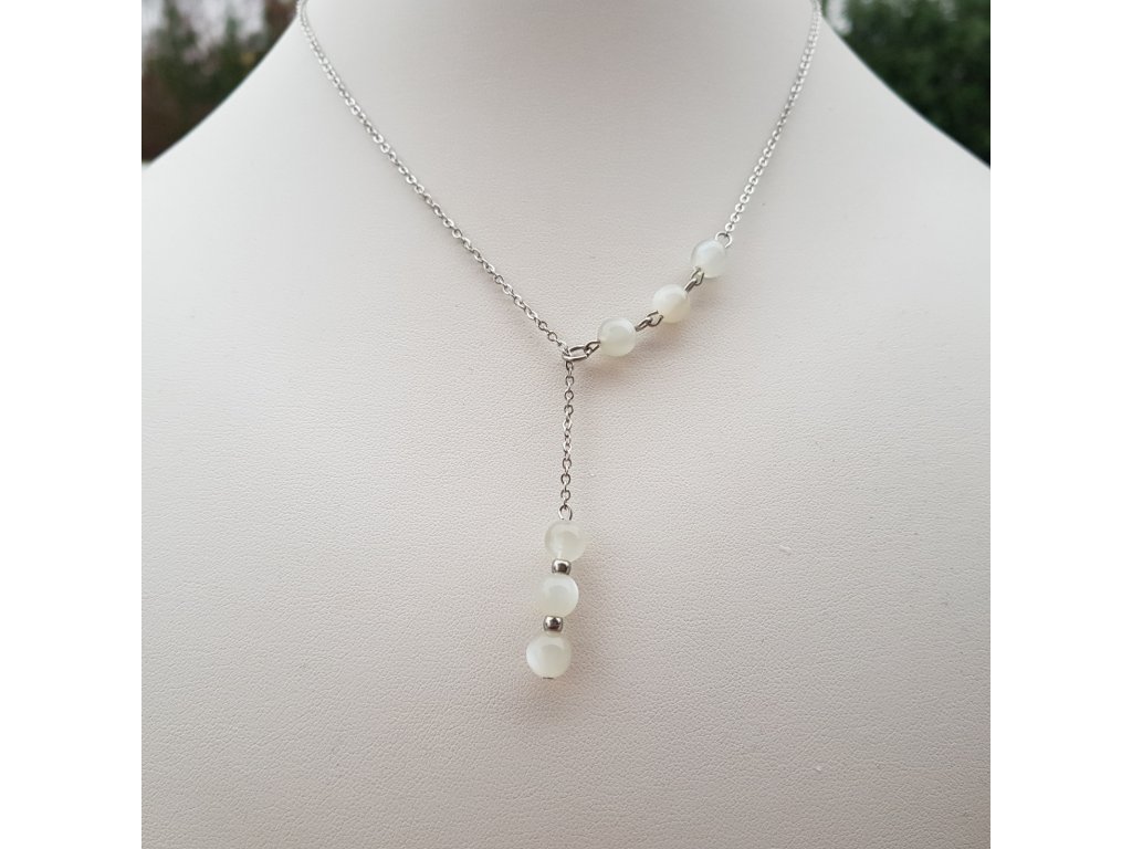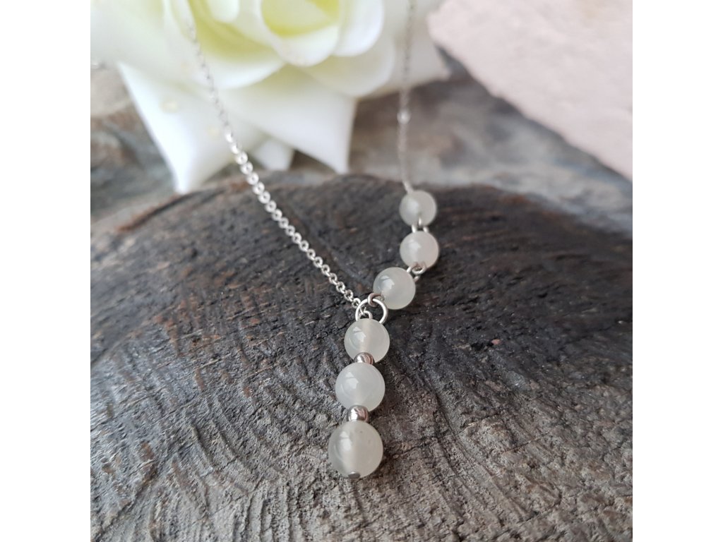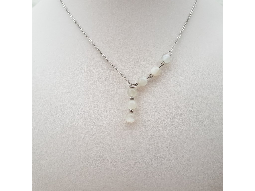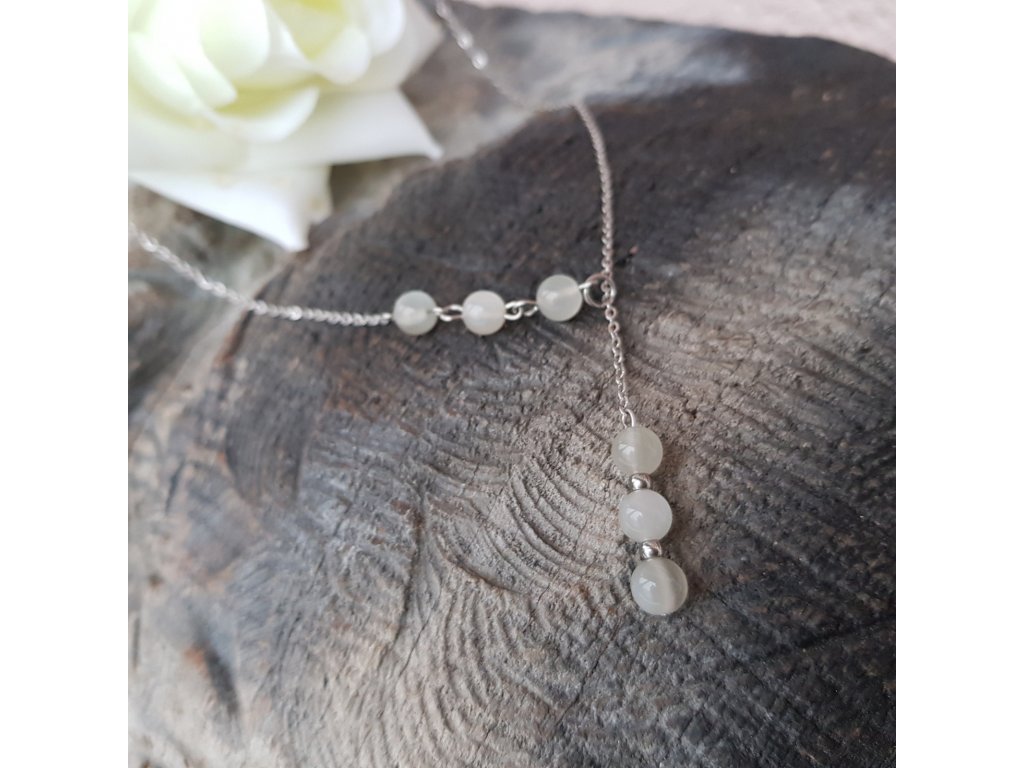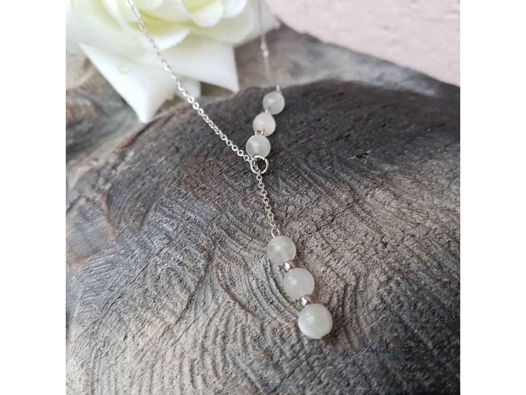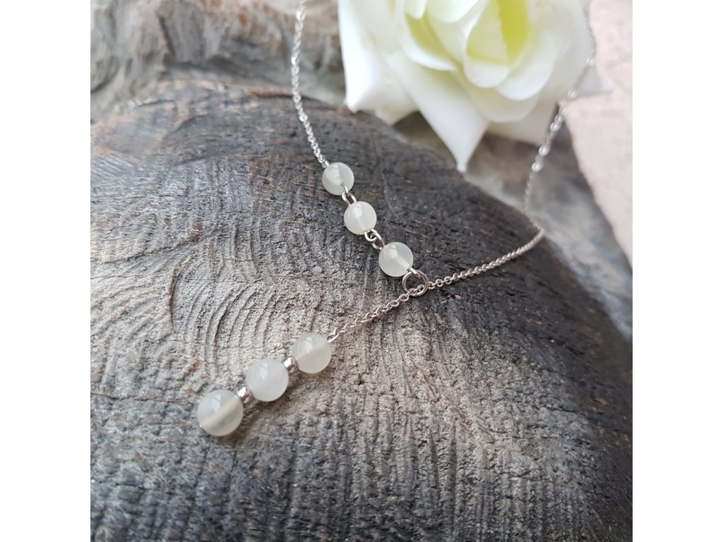 Šperk je z jedné strany zdobený ručně ketlovanými kuličkami měsíčního kamene na jemném řetízku. Druhou stranu náhrdelníku tvoří přívěsek provlečený malým kroužkem. Přívěsek lze libovolně posouvat.