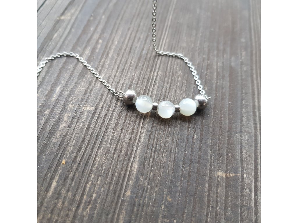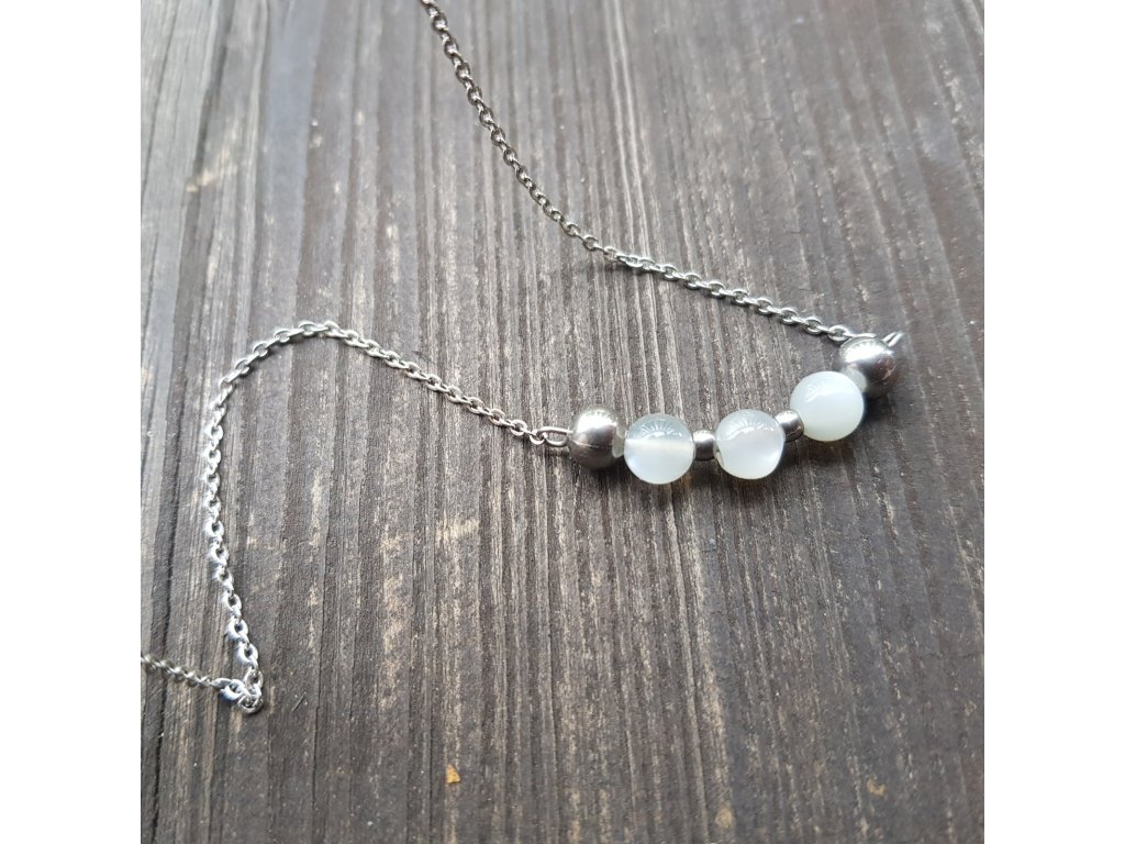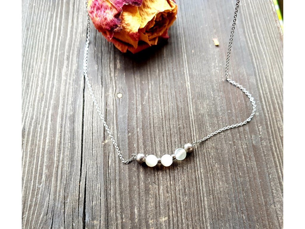 Minimalistický náhrdelník je tvořen z velmi kvalitního řetízku z nerezové oceli, zdobený kuličkami měsíčního kamene a korálků z chirurgické oceli.