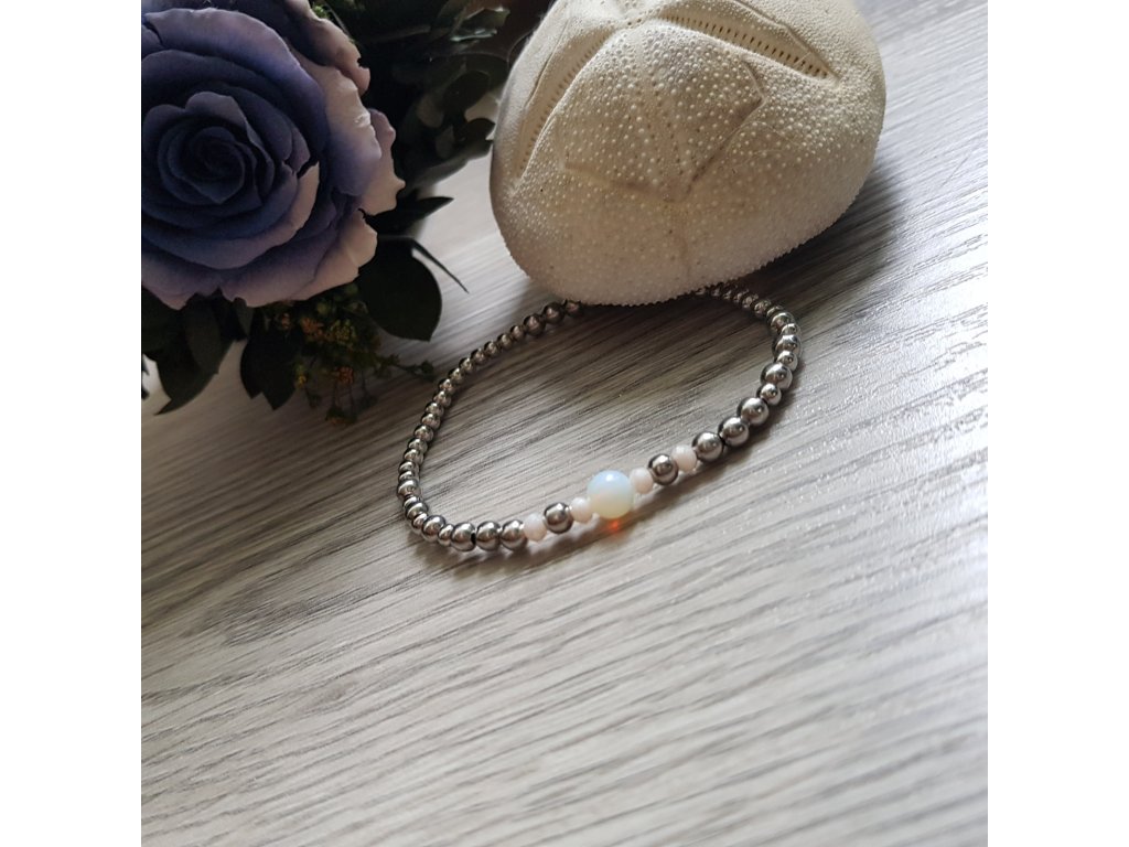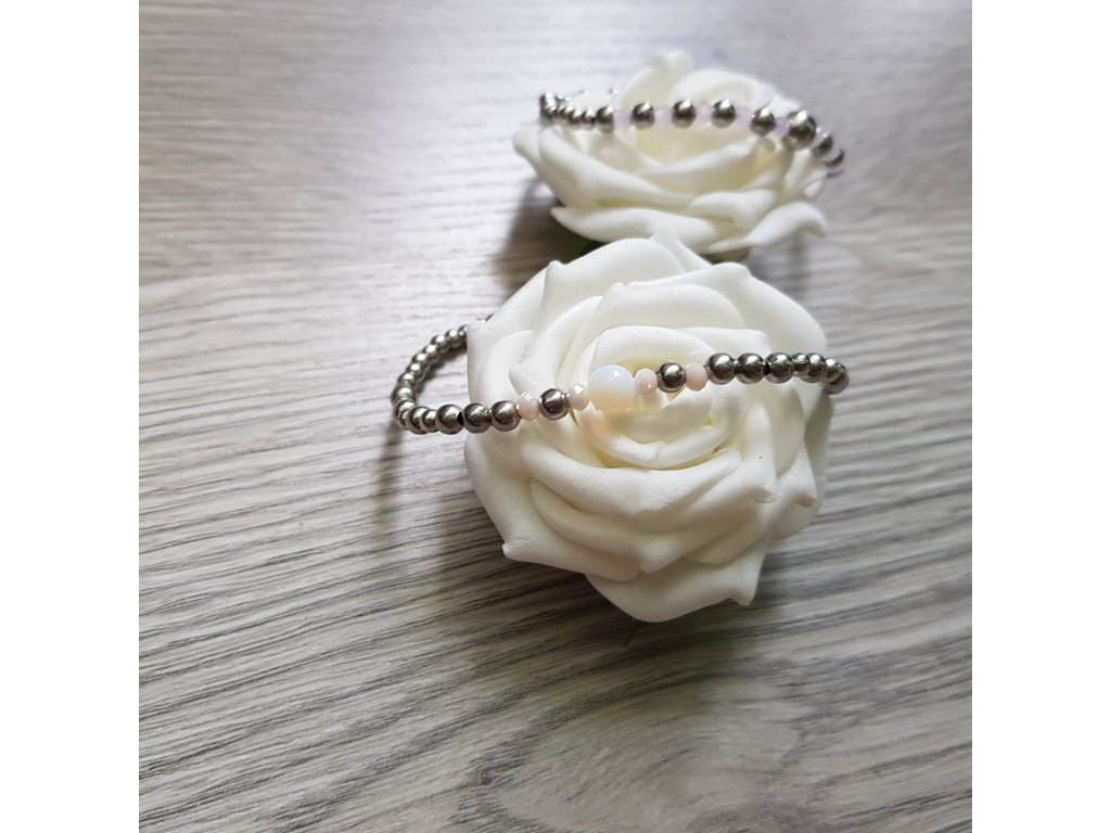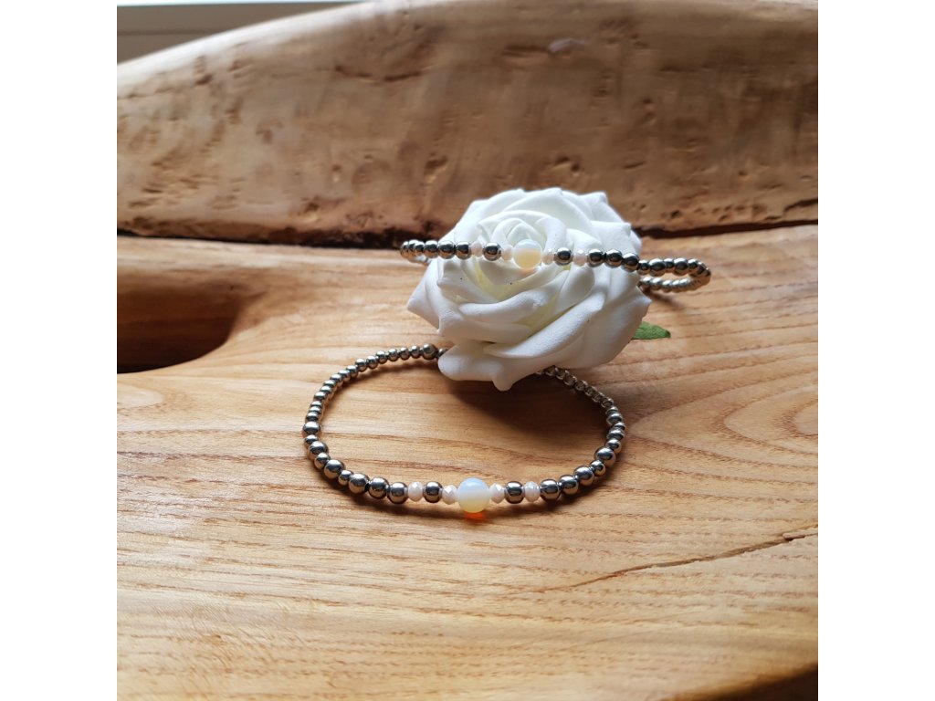 Jemný a velmi něžný náramek pro každou příležitost. Použili jsme droboučké korálky z chirurgické oceli, broušené kamínky a kuličku měsíčního kamene.