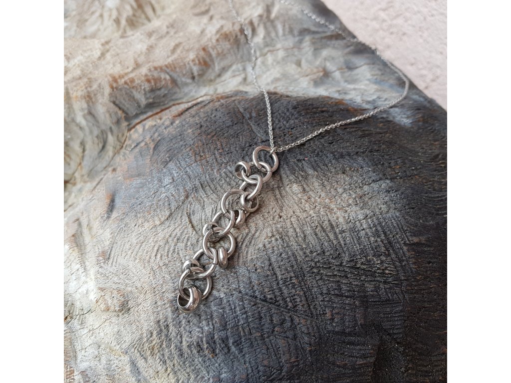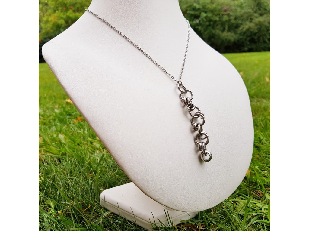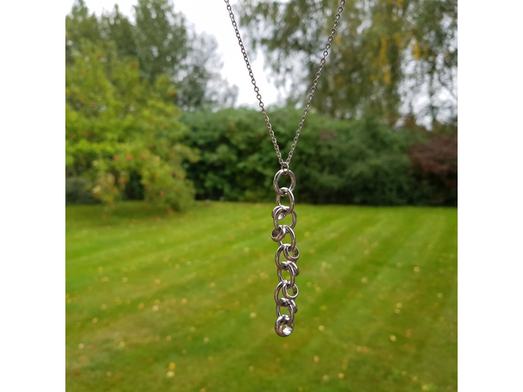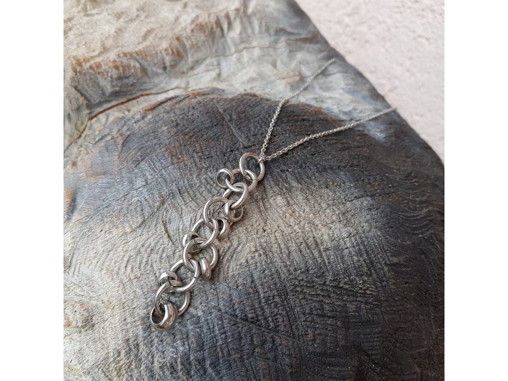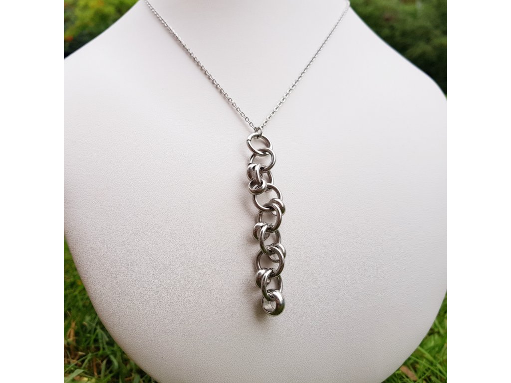 Dlouhý přívěsek z ručně vyrobených ocelových kroužků s volně pohybujícími se rondelkami je zavěšen na řetízku z chirurgické oceli.