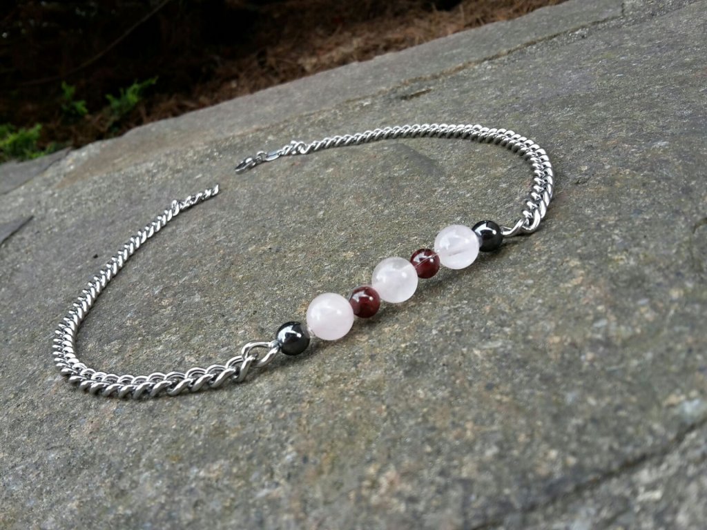Náhrdelník z nerezové oceli s minerály granátu 6 mm, hematitu 6 mm a růženínu 8 mm. Rozměry: 45 cm.