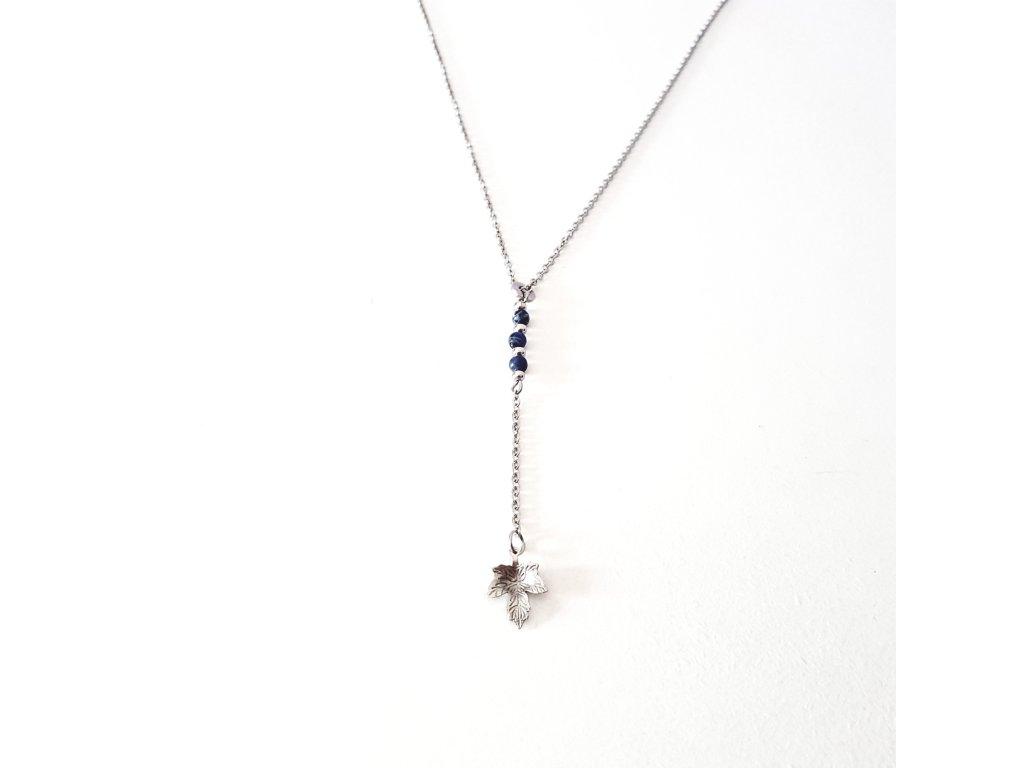 Ženskost, něžnost, jemnost... Náhrdelník s dlouhým přívěskem ze sodalitu, kuliček z chirurgické oceli a javorového lístečku. Náhrdelník působí velmi žensky.