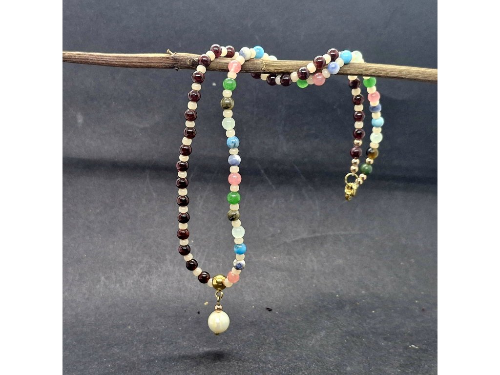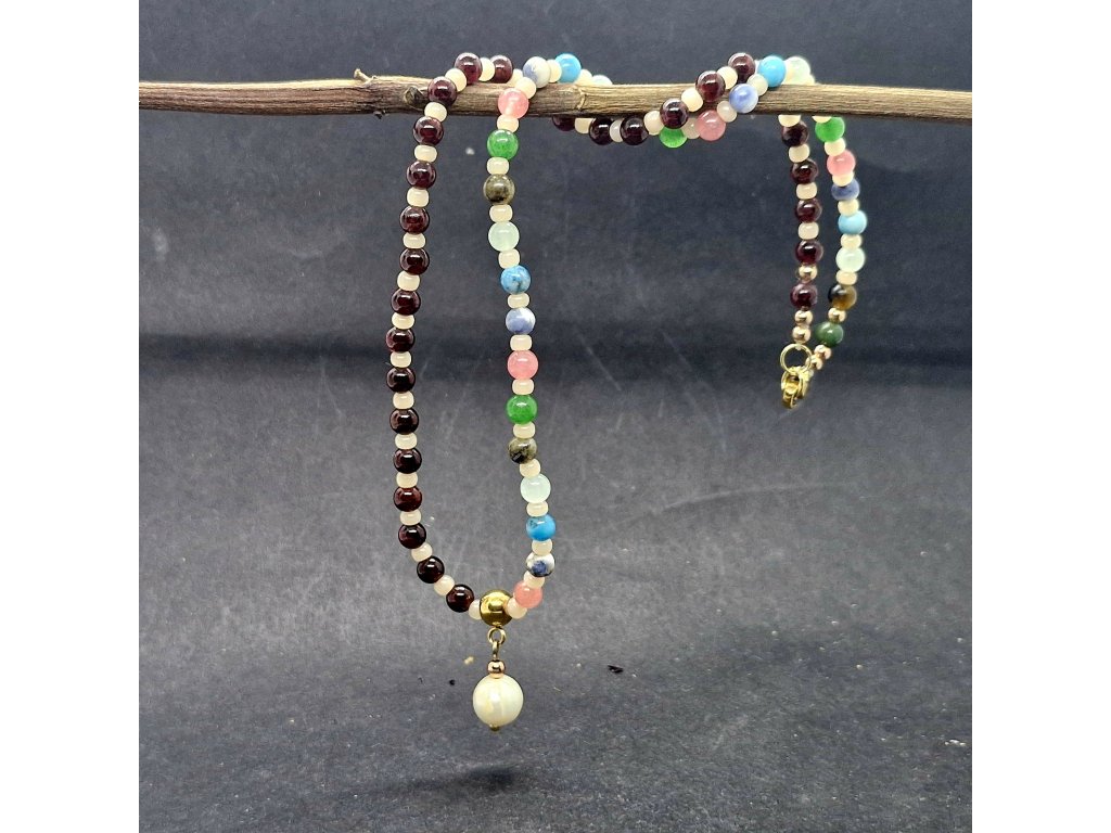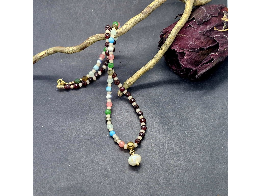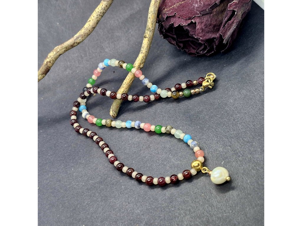 Tento šperk vypráví příběh o rovnováze. Jedna polovina náhrdelníku, tvořená hluboce červeným granátem, symbolizuje vášeň, sílu a životní energii. Druhá polovina je pestrou mozaikou avanturínu, sodalitu, jaspisu, amazonitu, achátu a labradoritu – jako rozkvetlá louka, která přináší klid, naději a harmonii. Minerály jsou prokládány rokajlem. Celý design završuje pravá sladkovodní perla, symbol čistoty a ženské moudrosti. Šperk pro ženu, která se nebojí být svá v každé své podobě.