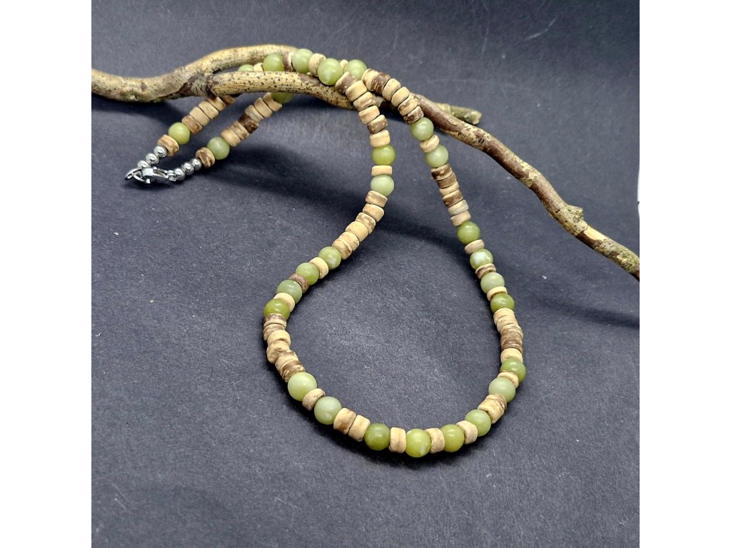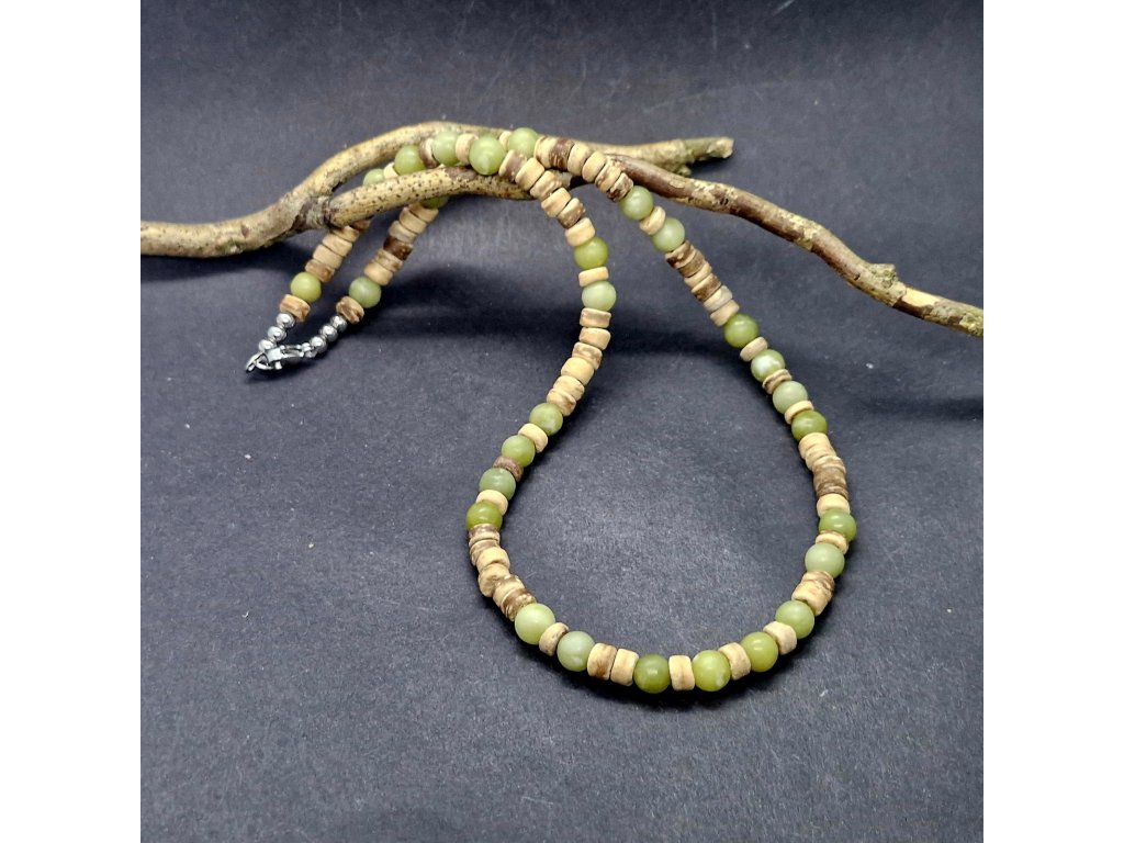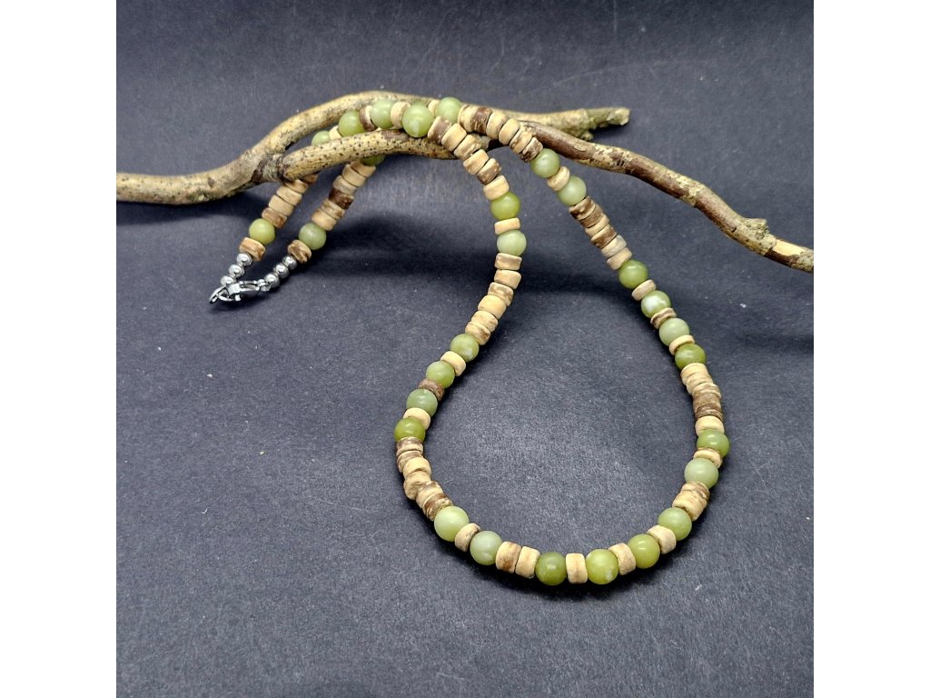 Tento pánský náhrdelník v sobě spojuje dvě tváře přírody – hřejivost kokosového dřeva a tajemnou hloubku serpentinu. Serpentin, přezdívaný „kámen regenerace“, svou zelenkavou barvou připomíná mechy a hluboké lesy, což z něj dělá perfektní doplněk pro každého moderního dobrodruha.