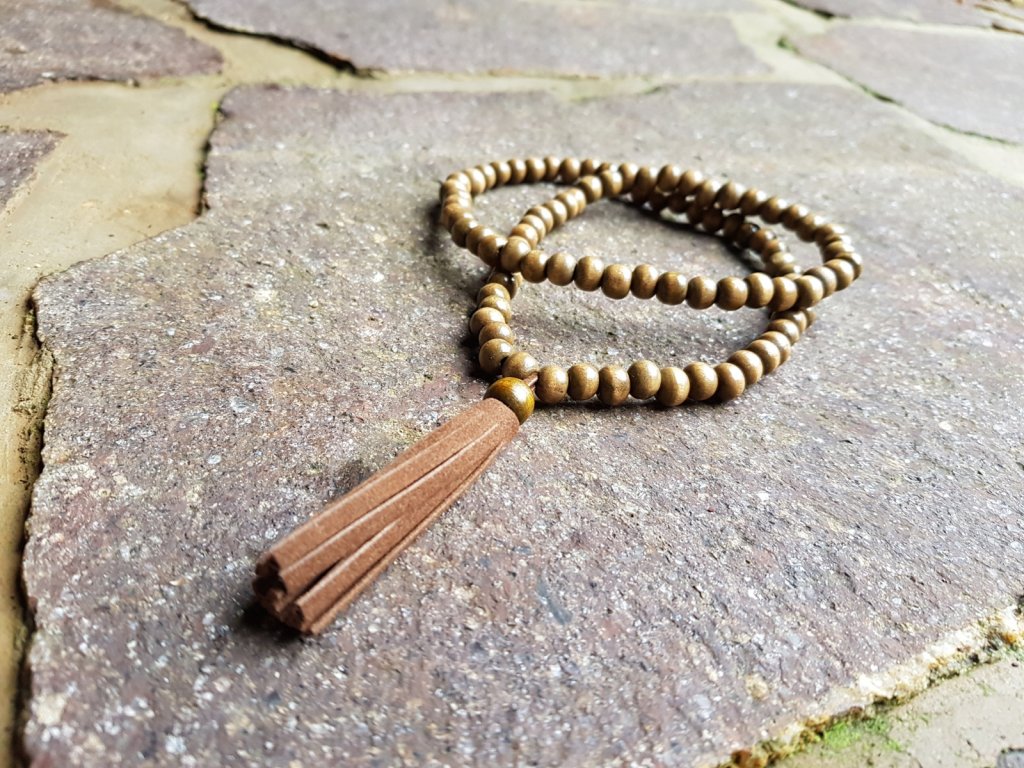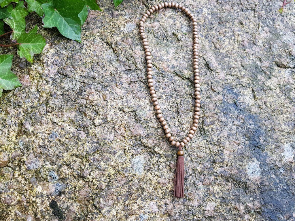 Nepřehlédnutelný přírodní náhrdelník v joga stylu. Tvořen je z dřevěných korálků o průměru 8 mm a střapce z eko kůže. Neobsahuje žádný kov, proto je vhodný i pro alergiky. Rozměry: Na pružném lanku 60 cm. Obléká se přes hlavu. Délka střapce 7 cm.