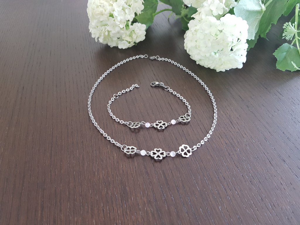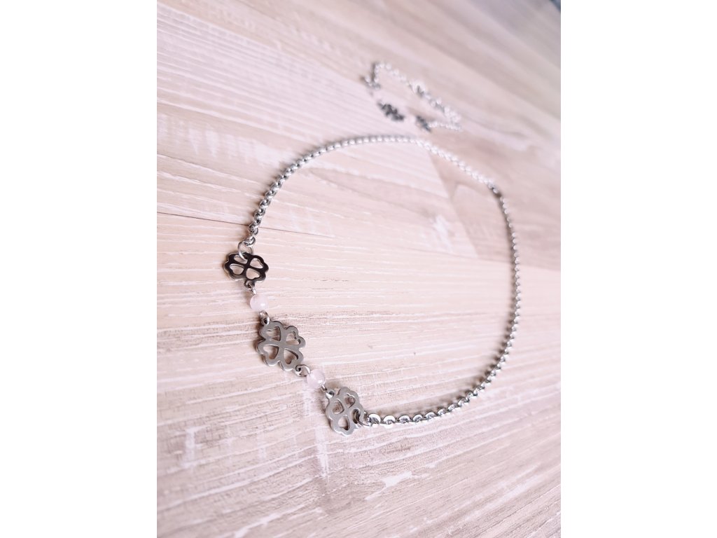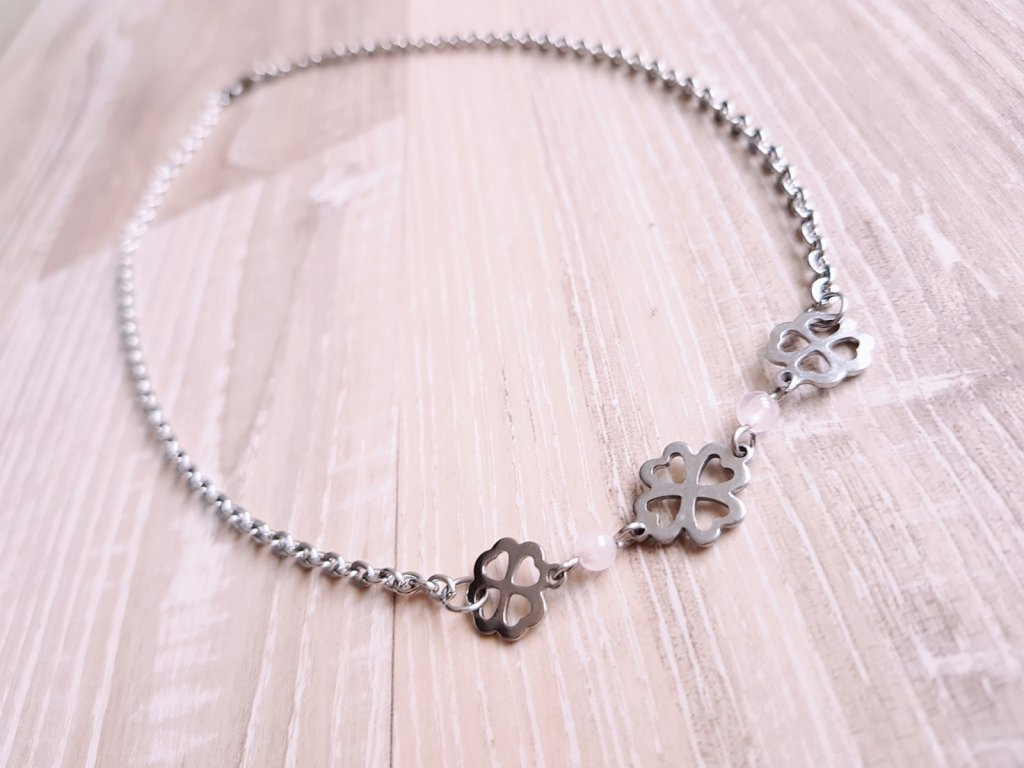 Trocha štístka v podobě originálního náhrdelníku. Čtyřlístky a kuličky růženínu o průměru 4 mm jsou napevno zakomponovány na řetízku z chirurgické oceli. Náhrdelníček působí velmi jemně a žensky ;-).