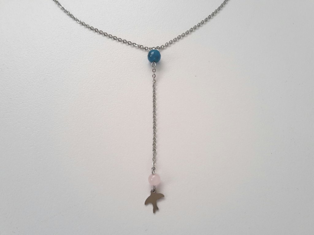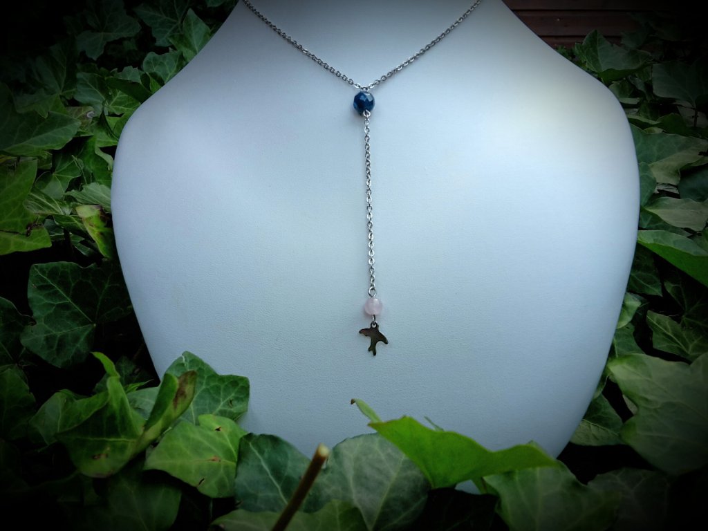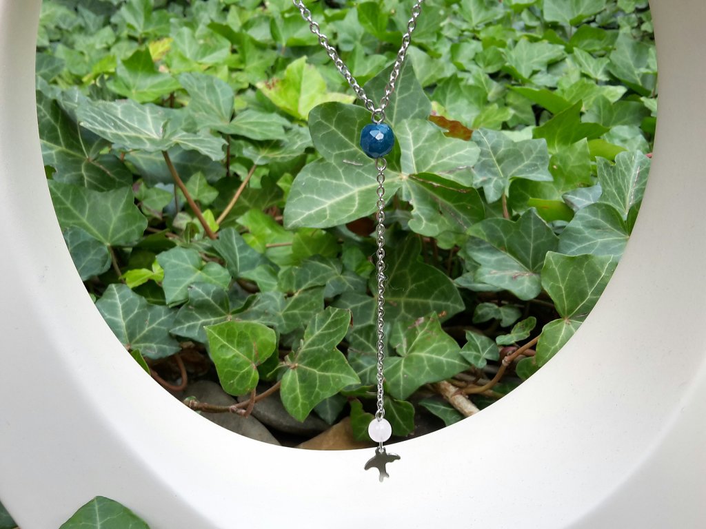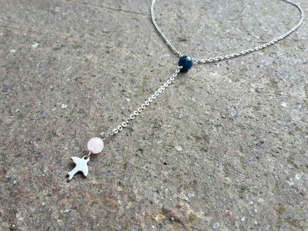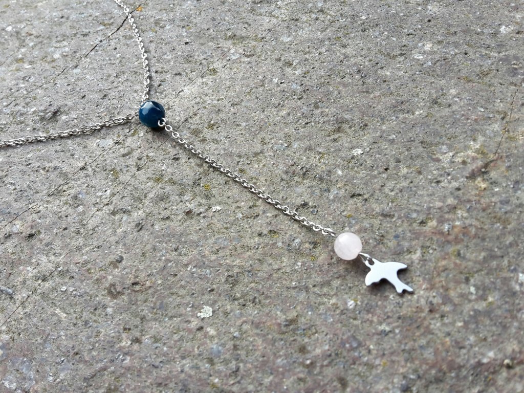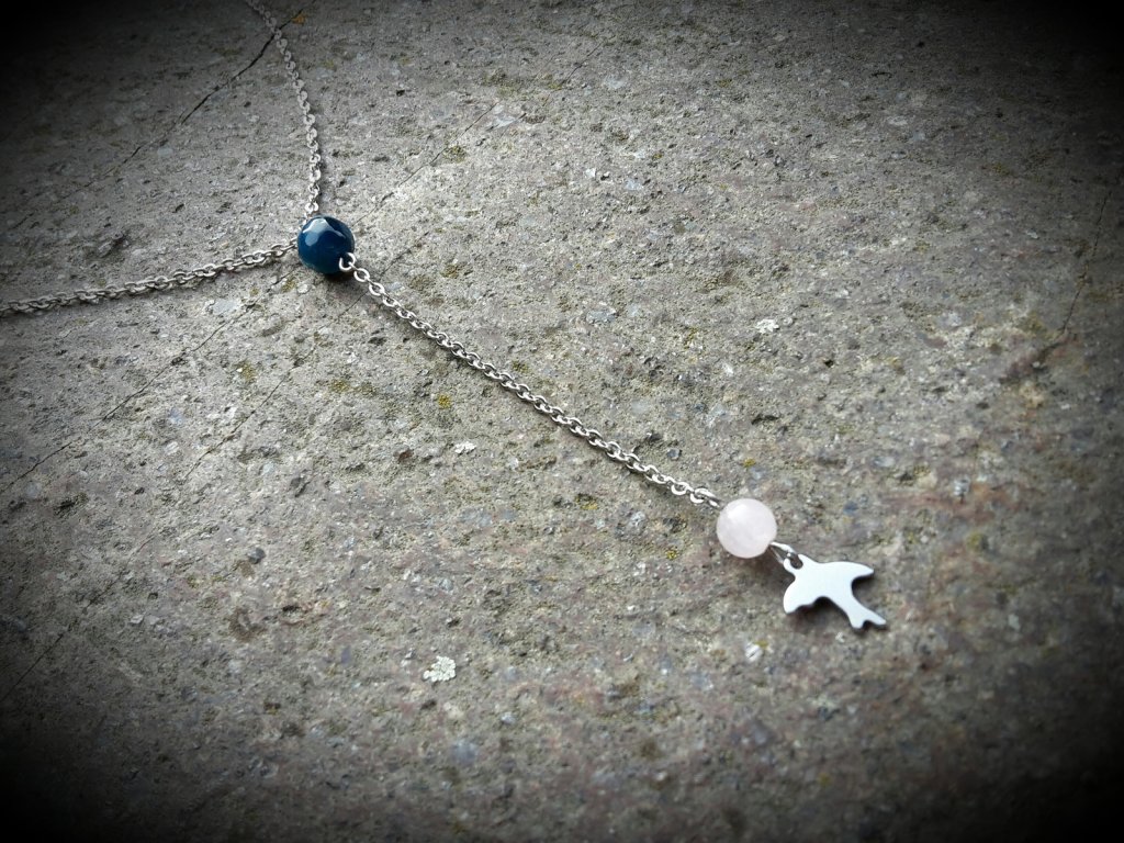 Něžný a velmi jemný náhrdelník inspirovaný lehkostí a svobodou ptáčků. Použili jsme řetízek z chirurgické oceli, do kterého jsme napevno zakomponován přívěsek z kuličky fasetového achátu 8 mm, růženínu 6 mm a řetízku s ptáčkem z chirurgické oceli. Přívěsek směřuje do výstřihu a působí velice ženský. Veškeré komponenty ocelové a vhodné i pro alergiky na bižuterní kov. Achát má značné ochranné účinky, vytváří ochranný štít kolem těla. Navozuje pocit bezpečí a jistoty. Růženín je symbolem lásky a krásy. Dodává vnitřní klid a prohlubuje přátelství. Rozměry: Délka okolo krku 38 cm. Délka přívěsku do výstřihu 10 cm. Nebo dle vašeho přání. K náhrdelníku obdržíte kartičku s popiskem o účincích kamenů.