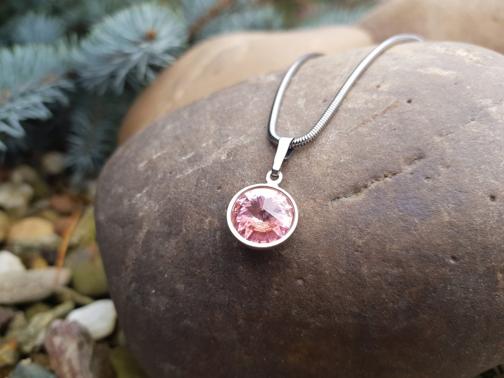Jemný náhrdelník je tvořen z velmi kvalitního ocelového řetízku (hádě) a přívěsku s růžovým kamenem Swarovski. Naše ocel je velice odolná, nemění barvu ani tvar a je vhodná i pro alergiky. Rozměry: Délka řetízku 43 cm. Průměr přívěsku 13 mm.