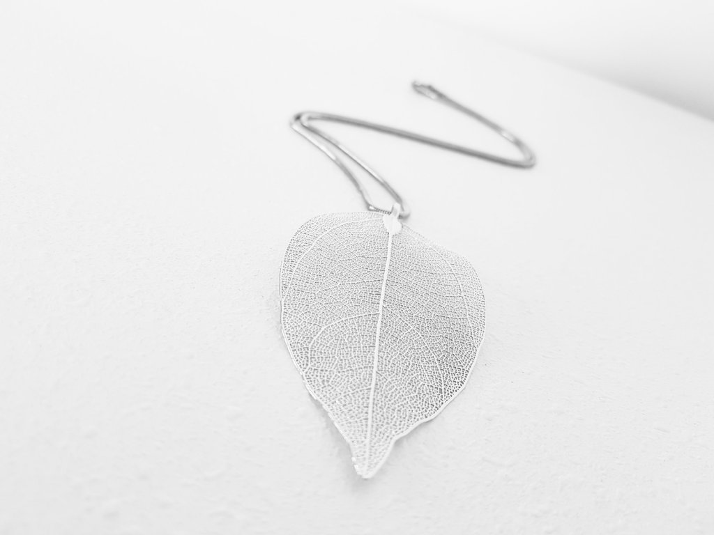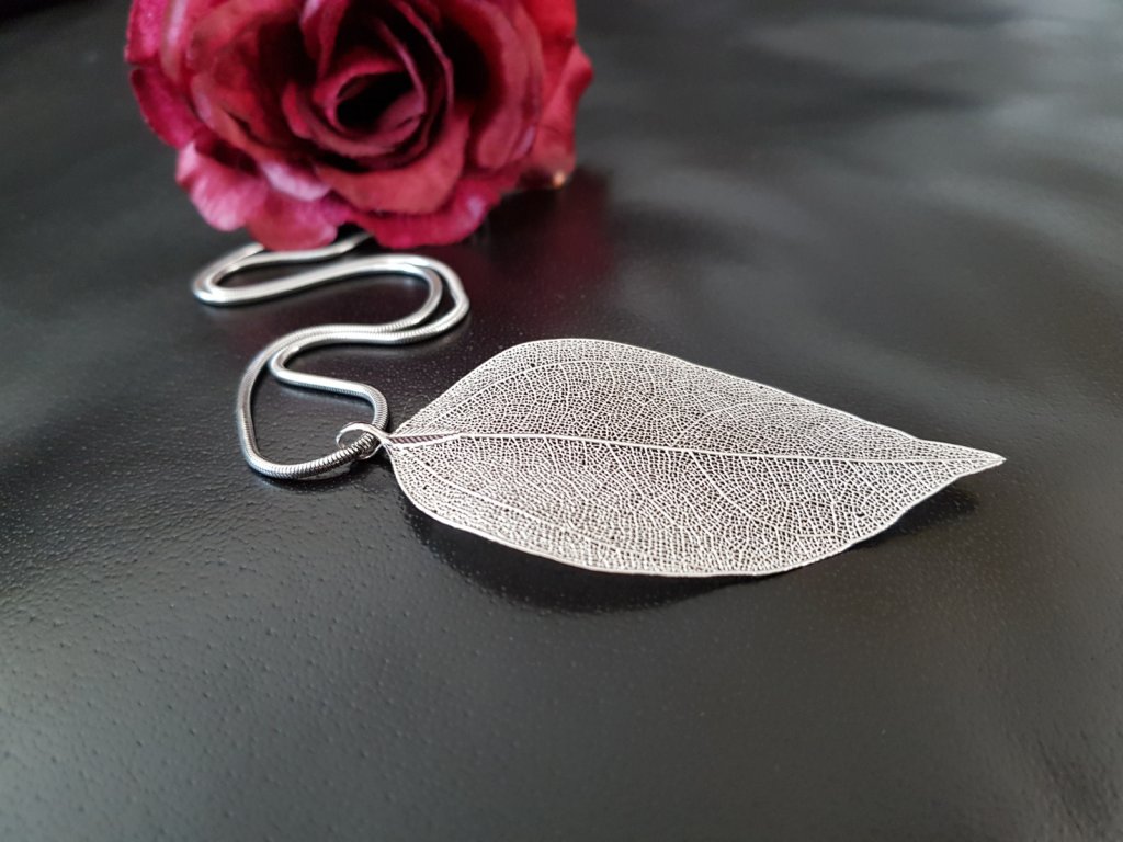 Originální a velice ženský náhrdelník s přívěskem lístku. Přívěsek je tvořen z přírodního listu, který je upraven pokovením a zavěšen na hadím řetízku z velmi kvalitní nerezové oceli. Rozměry: Délka řetízku 45 cm. Průměr listu cca 7×4 cm. Každý list je originál a může se nepatrně lišit tvarem, strukturou a velikostí.