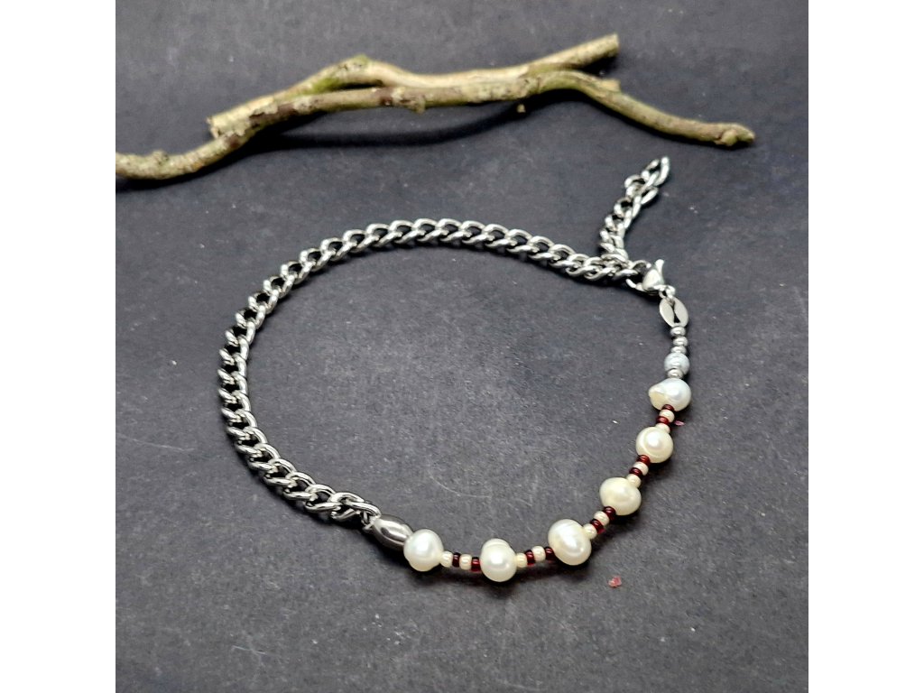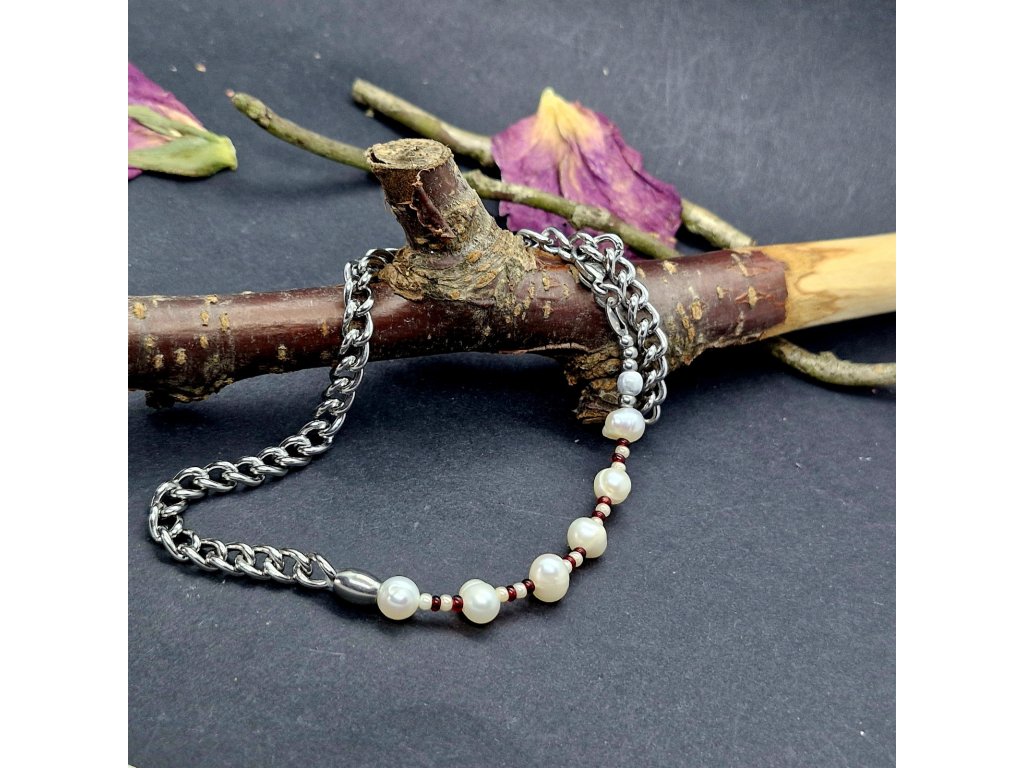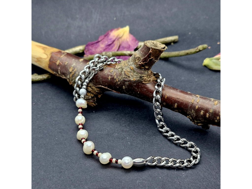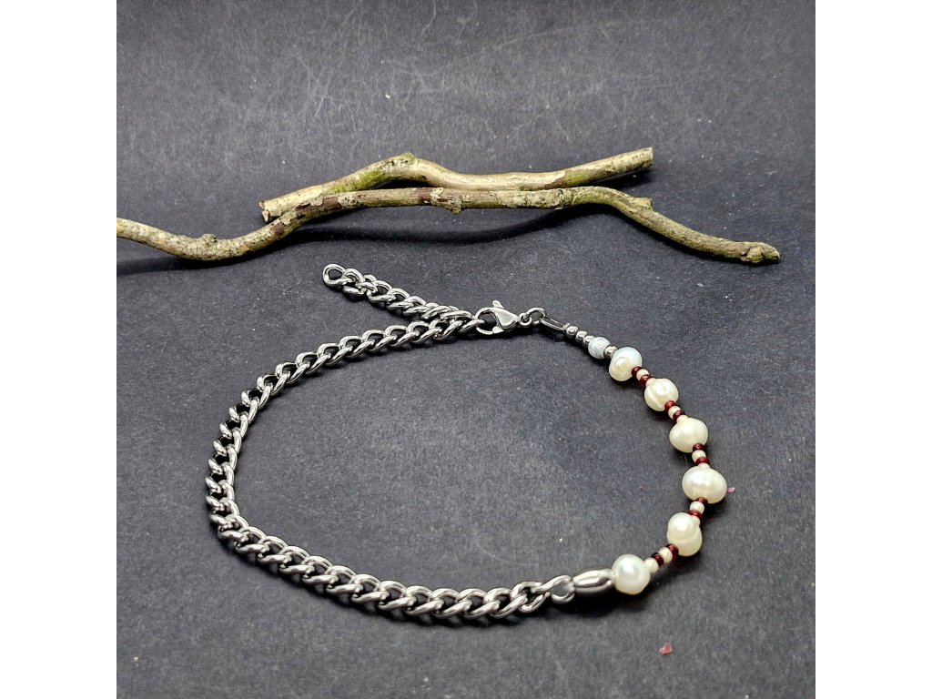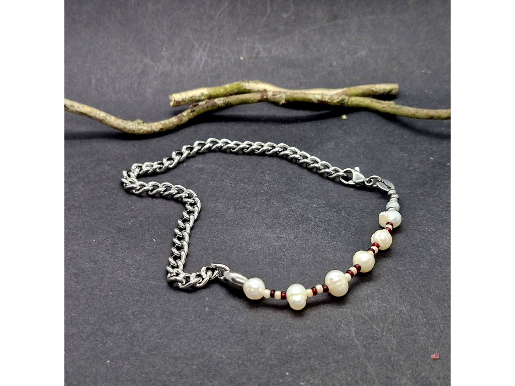 Na nákotník jsme zvolili masivnější řetízek z nerezové oceli, na který jsme napevno zakomponovali říční perly a rokajl.