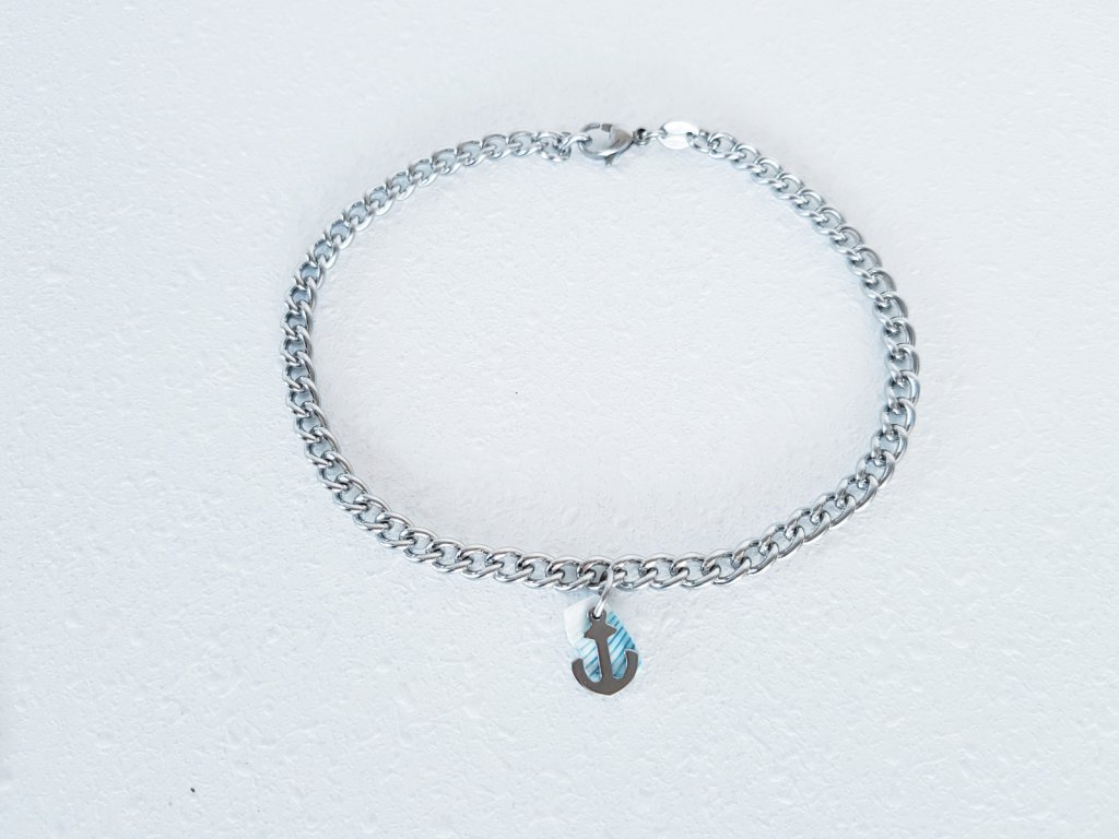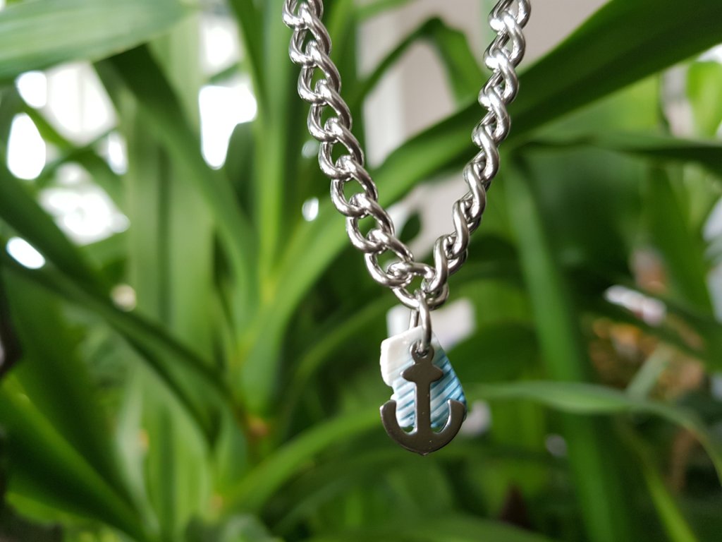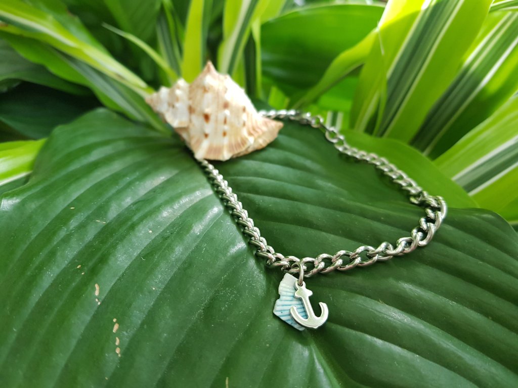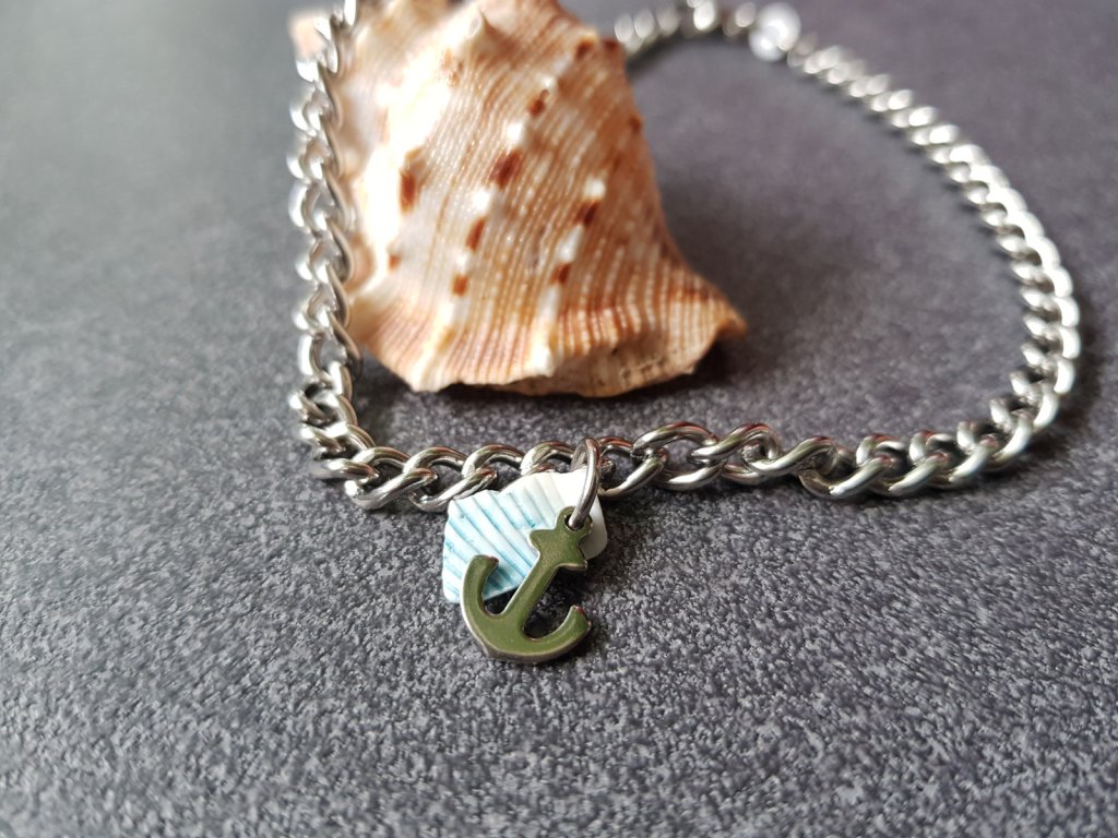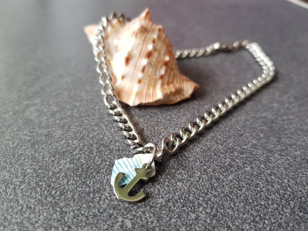 Nepřehlédnutelný nákotník s přívěskem kotvičky a zlomku pravé mušle.