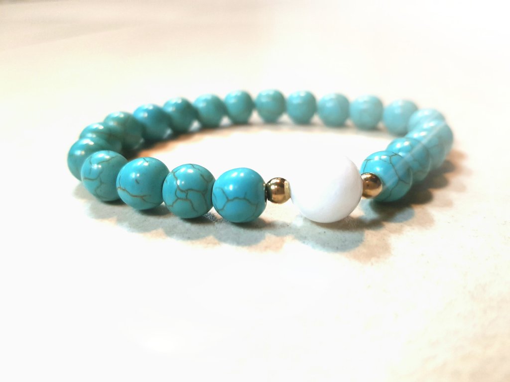 Takové malé modré z nebe :-). Náramek z tyrkysu o průměru 8 mm, jadeitu 10 mm a kuliček z chirurgické oceli s vrstvou pravého zlata. Rozměry: Na pevném pružném lanku 16 - 17,5 cm. Nebo dle Vašeho přání. K náramku obdržíte kartičku s popisem o účincích tyrkysu.