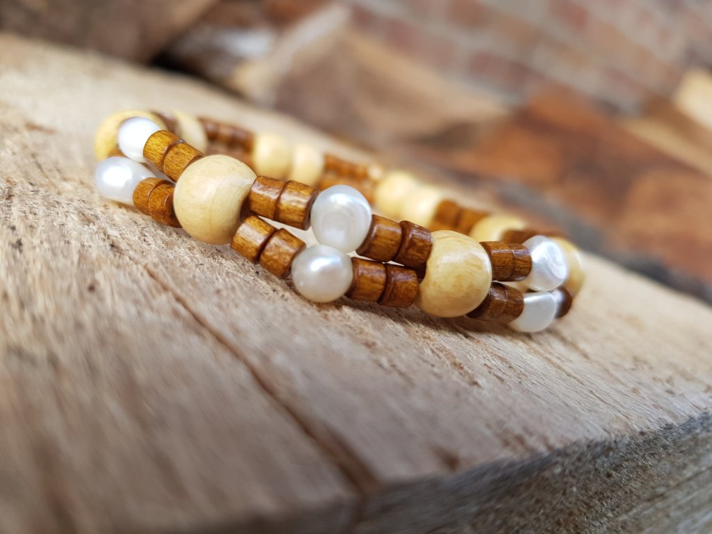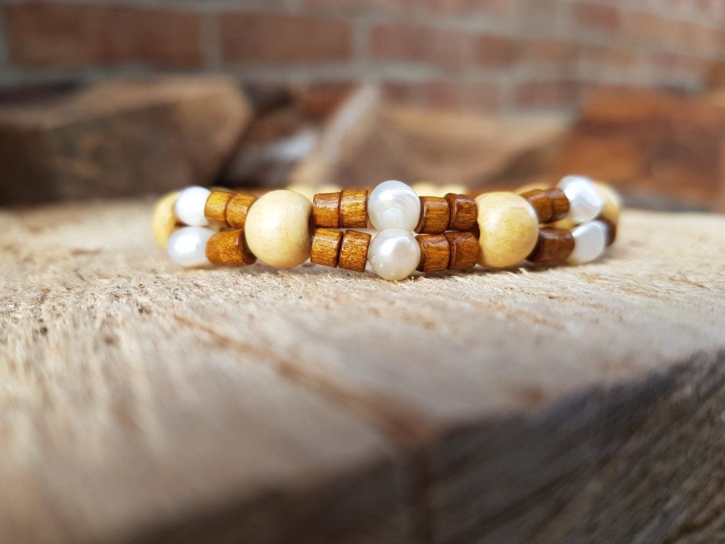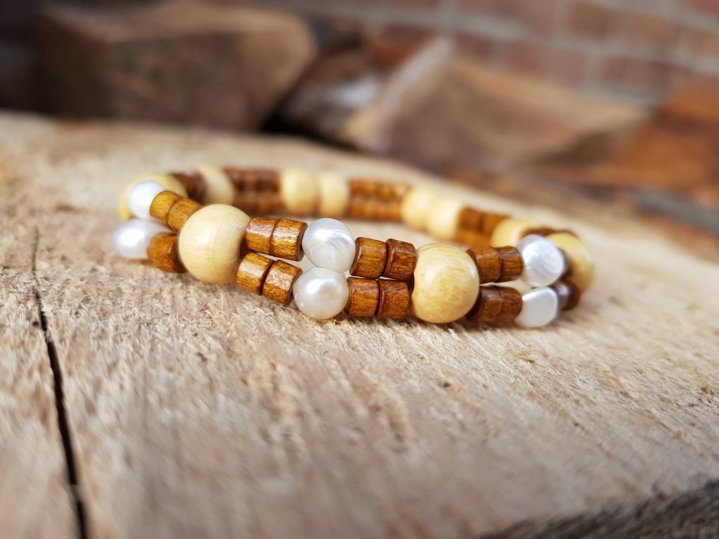 Originální náramek pro milovnice přírody. Tvořen je z drobných dřevěných korálků (soudků), dřevěných kuliček o průměru 8 mm a šesti sladkovodních perliček cca 6 mm. Perly jsou přírodní a každá se tvarově nepatrně liší. Rozměry: Náramek je pružný 17 - 18 cm.