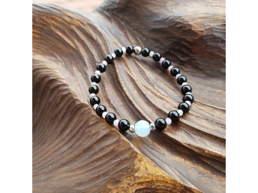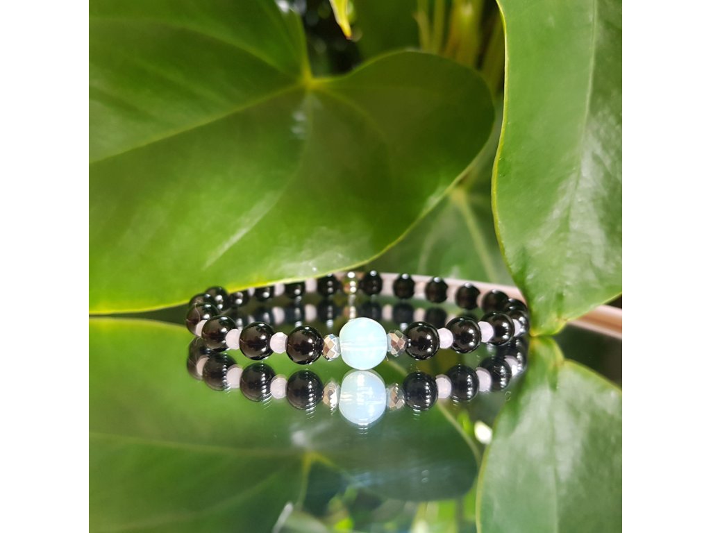 Elegantní a velmi jemný náramek. Použili jsme onyx o průměru 6 mm, měsíční kámen 8 mm a drobné broušené korálky v růžové barvě.
