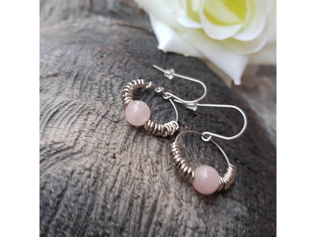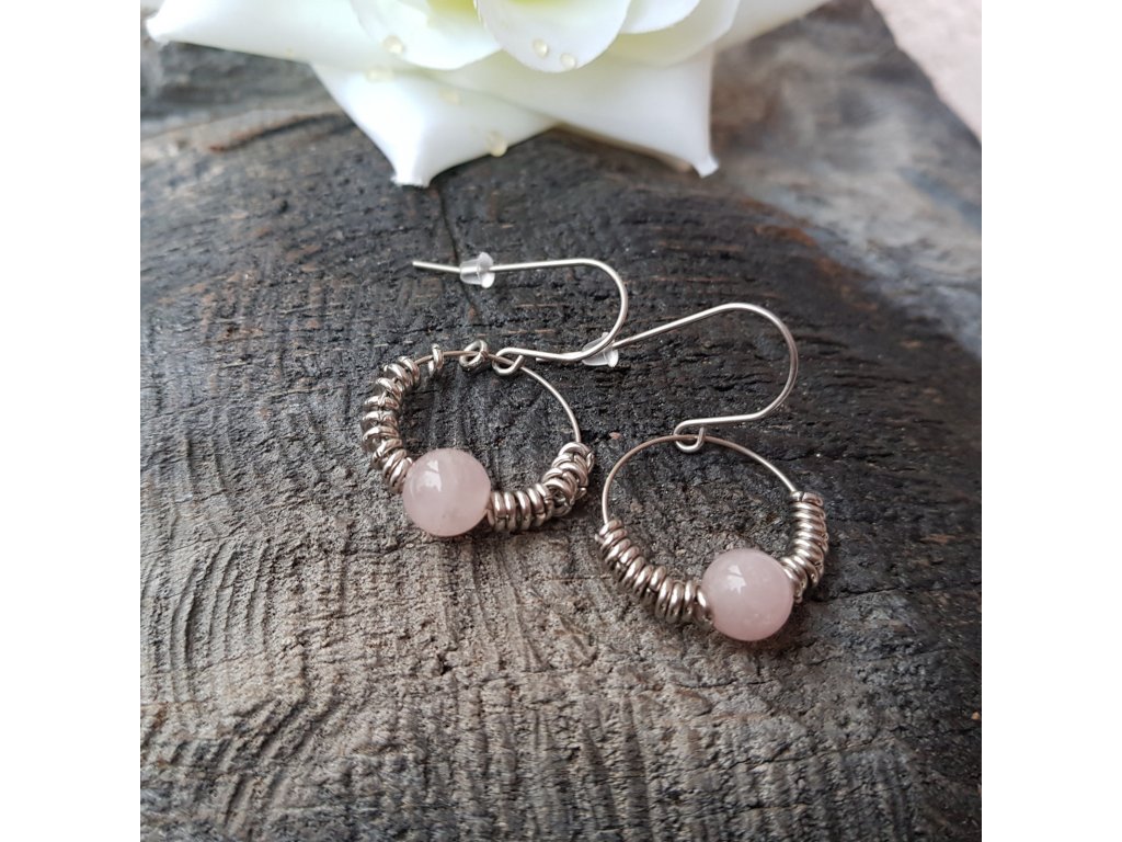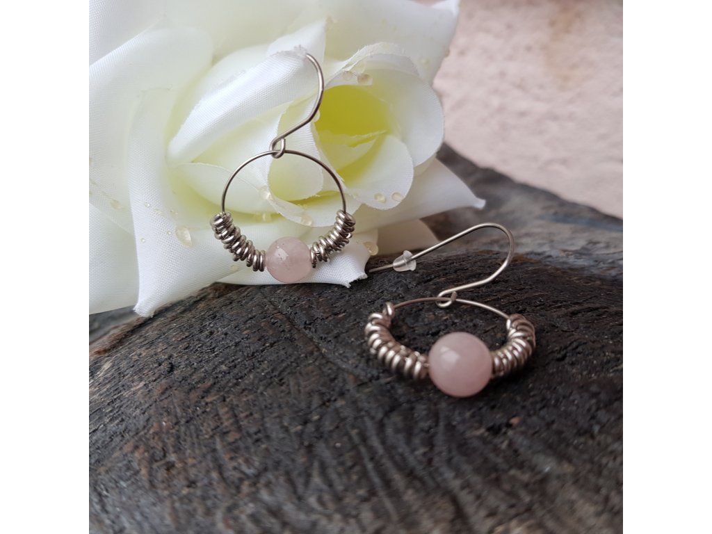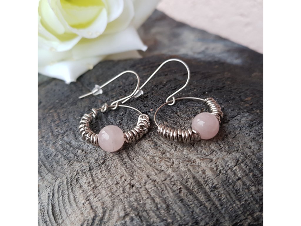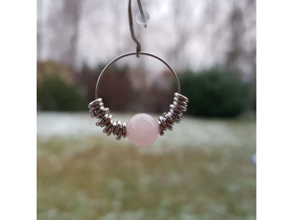 Tenké kruhy s napevno zakomponovanou kuličkou růženínu o průměru 8 mm a volně zavěšenými kroužky na minimalistickém afroháčku.
