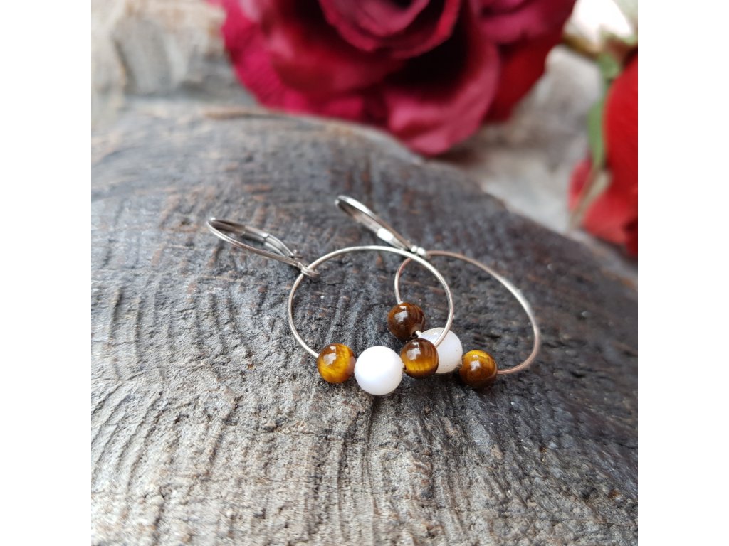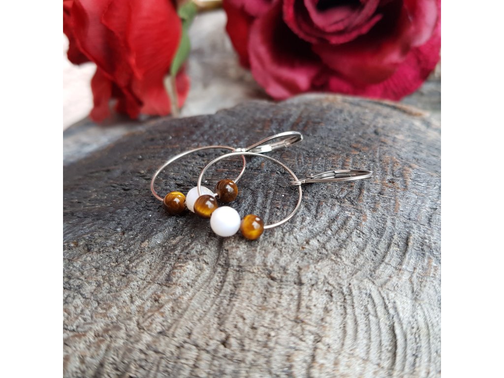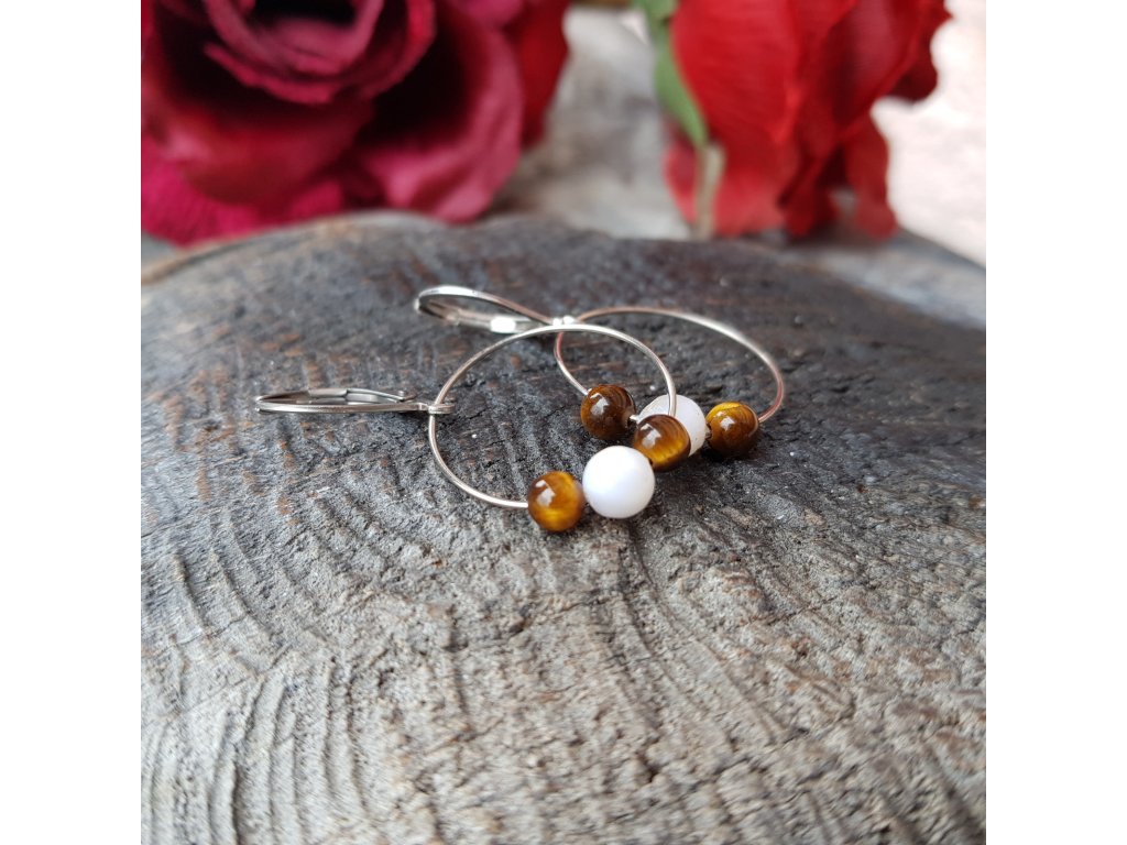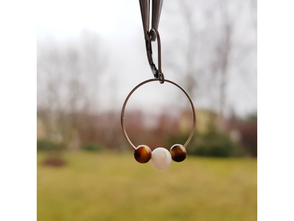 Jemné kroužky s napevno zakomponovanou perleťovou kuličkou o průměru 5 mm a volně navlečenými kuličkami tygřího oka 4 mm. Mechanické zapínání je z velmi kvalitní nerezové oceli, která nemění barvu ani tvar a je vhodná i pro alergiky.