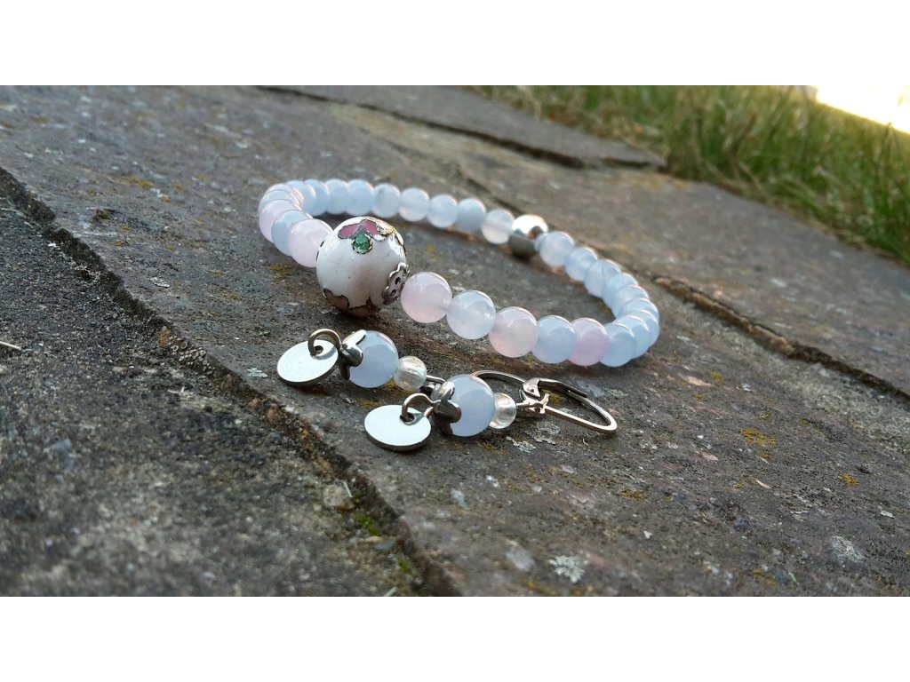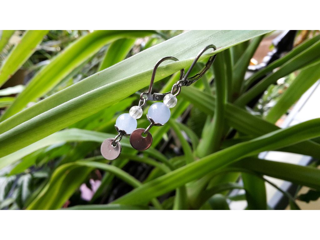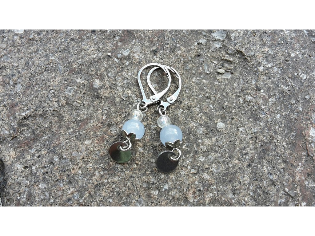 Něžné náušnice z chirurgické oceli s přívěsky z modrého jadeitu a placiček o průměru 6 mm. Rozměry: Celková délka 3 cm. Průměr kuliček jadeitu 6 mm. Veškeré komponenty jsou ocelové a vhodné pro alergiky na bižuterní kov.