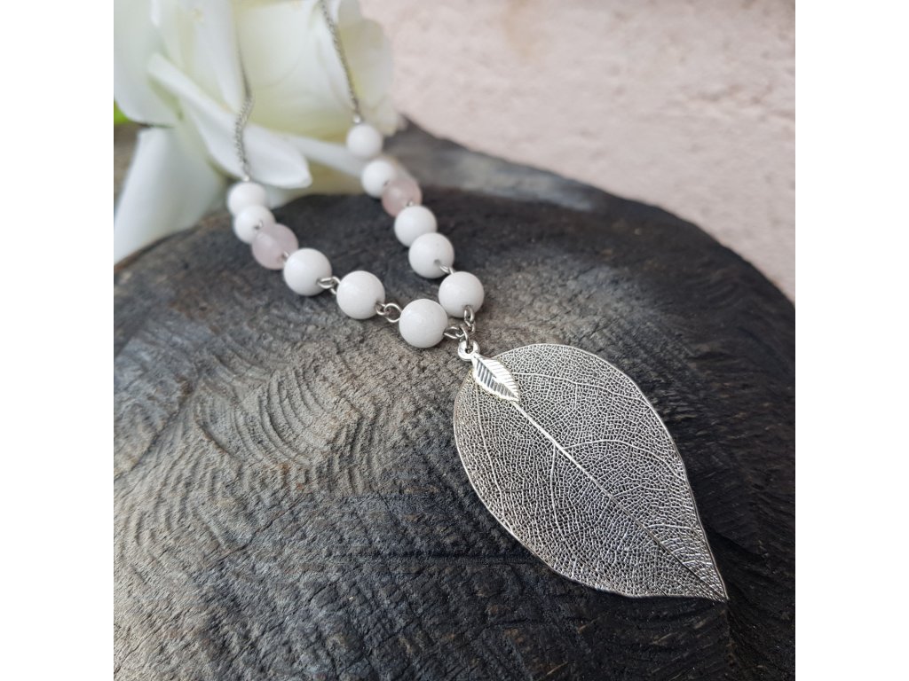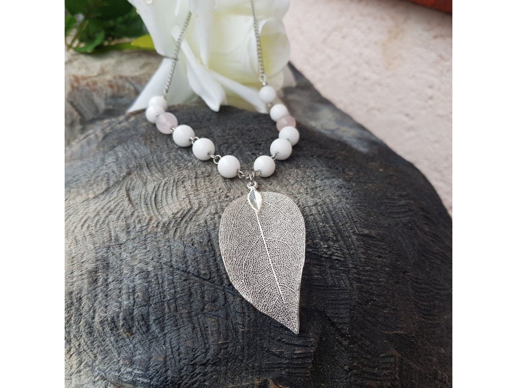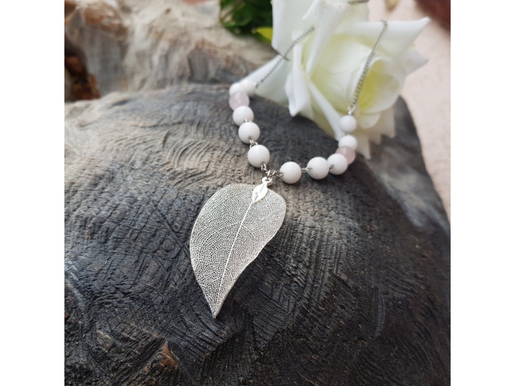 Hrátky s lístky ve stříbrném kabátku. Originální a velice ženský náhrdelník. Přívěsek je tvořen z přírodního listu, který je speciálně upraven pokovením. Na náhrdelník jsme dále použili řetízek z velmi kvalitní nerezové oceli, malajský nefrit a růženín.