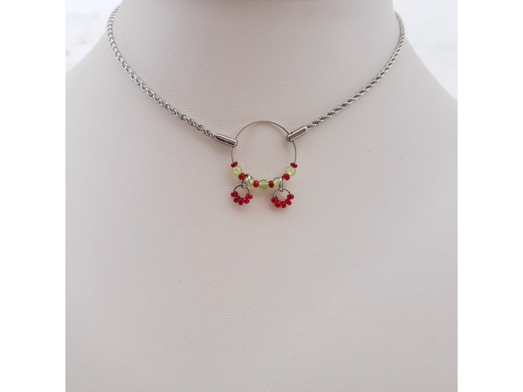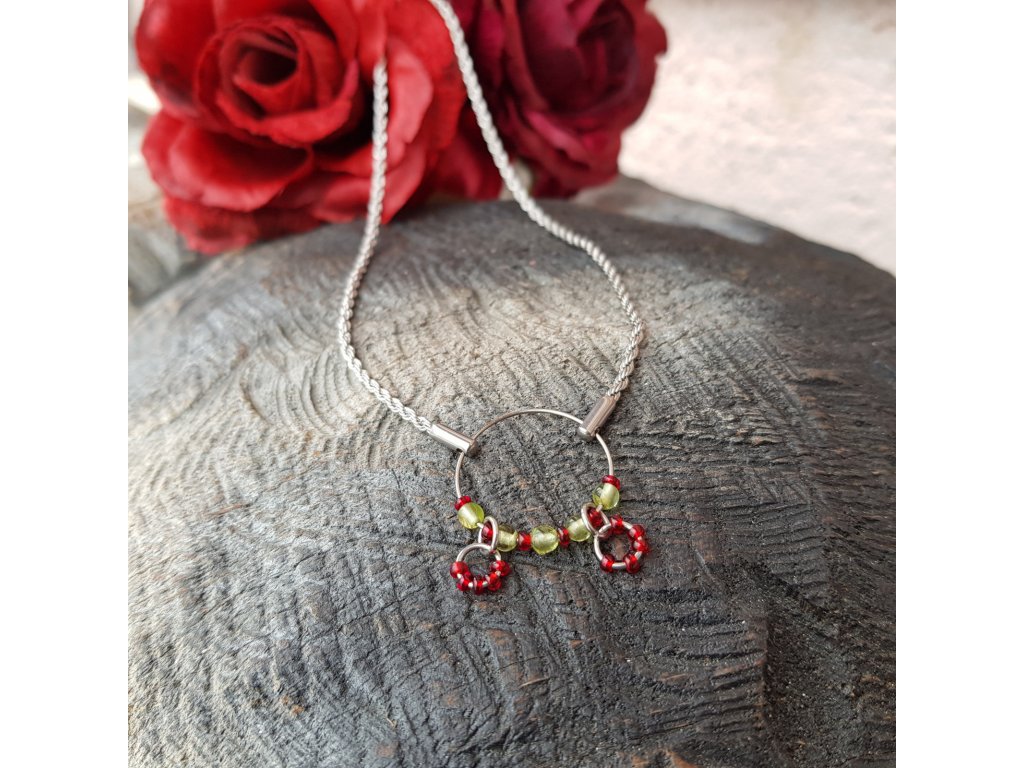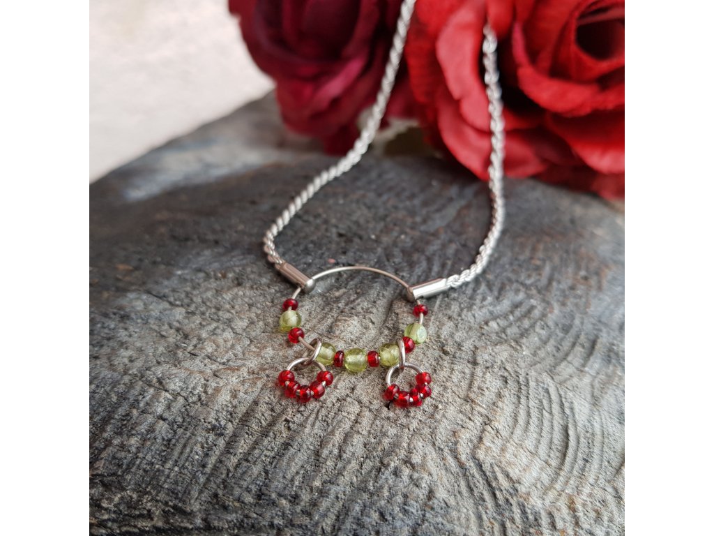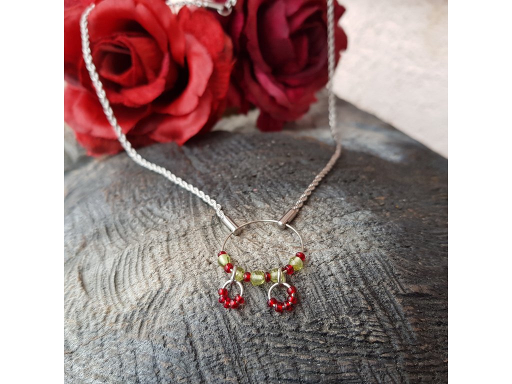 Tenký kruh s kuličkami olivínu, rokajlem a drobnými kroužky je zavěšen na ozdobném krouceném řetízku z nerezové oceli.