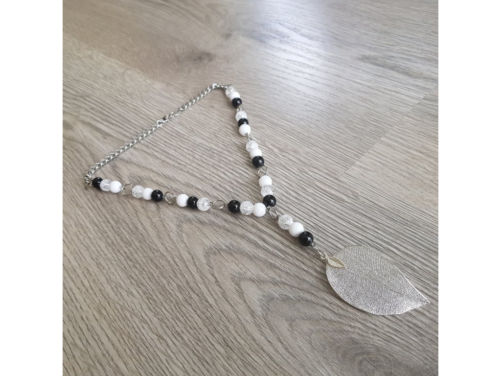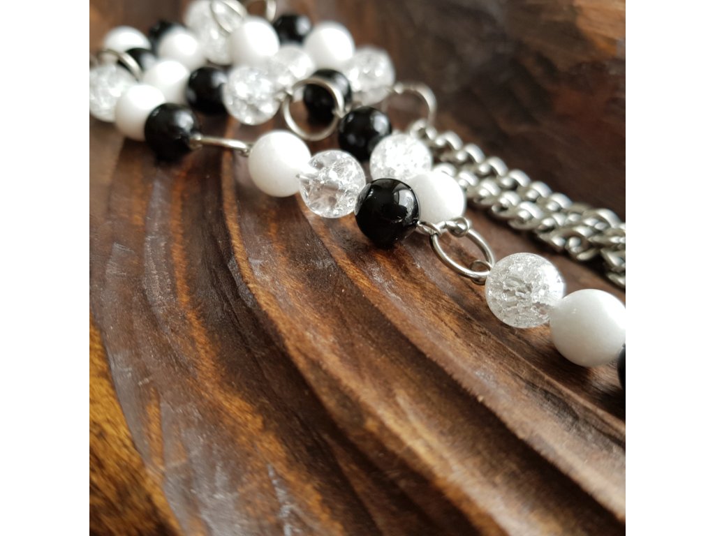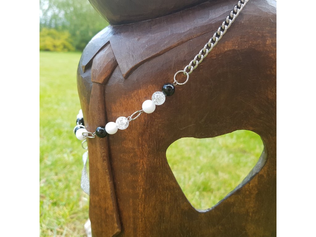 Na náhrdelník jsme použili kuličky onyxu, malajského nefritu a praskaného křišťálu. Minerály jsou zavěšeny na řetízku z velmi kvalitní nerezové oceli.