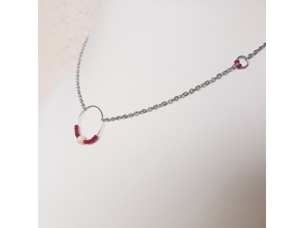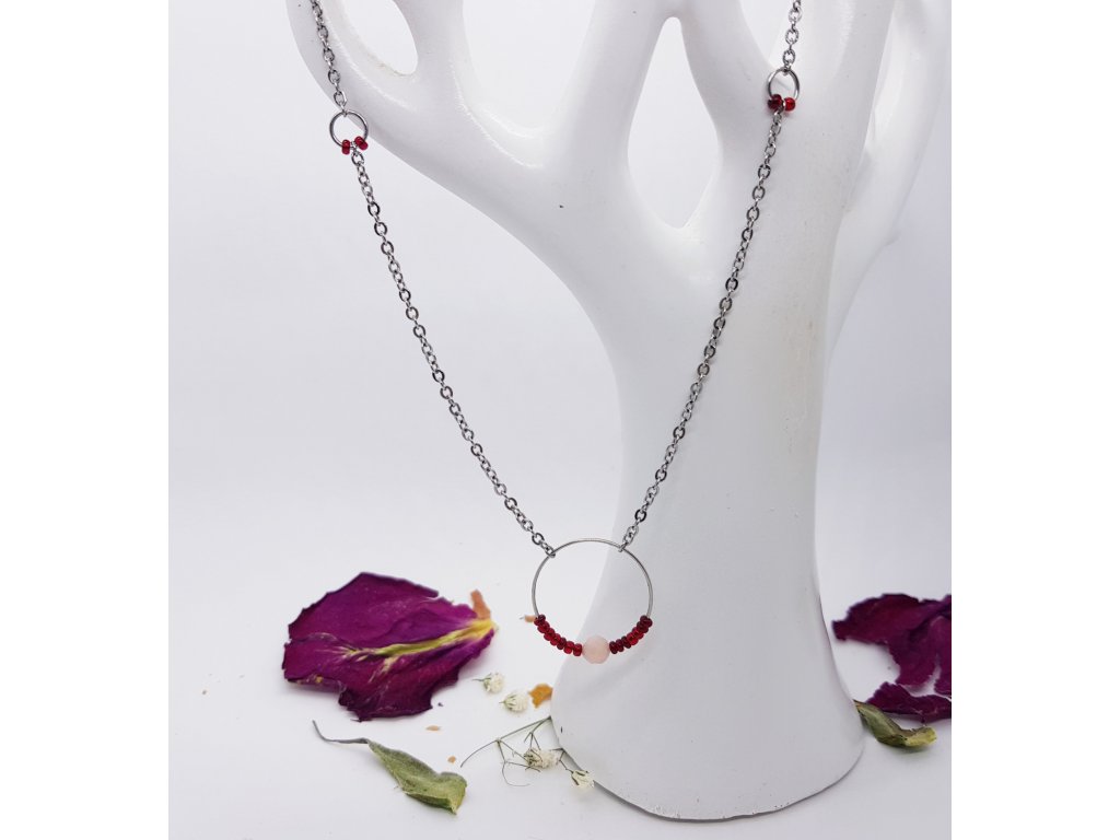 Tenký pružný kroužek se zakompovaným broušeným růžovým opálem a volně navlečeným rokajlem je zavěšen na řetízku z chirurgické oceli.