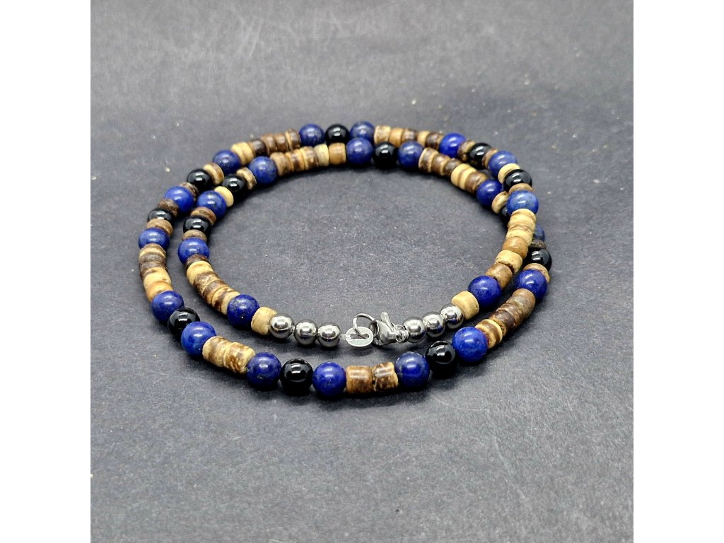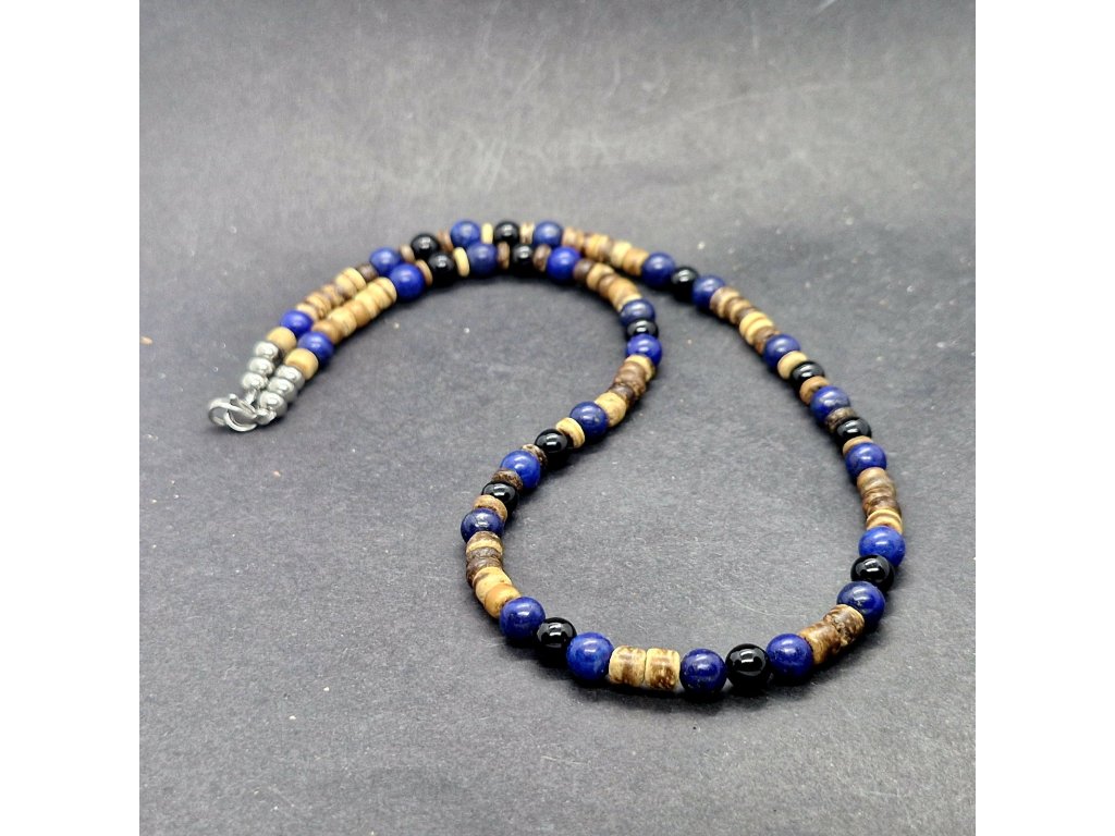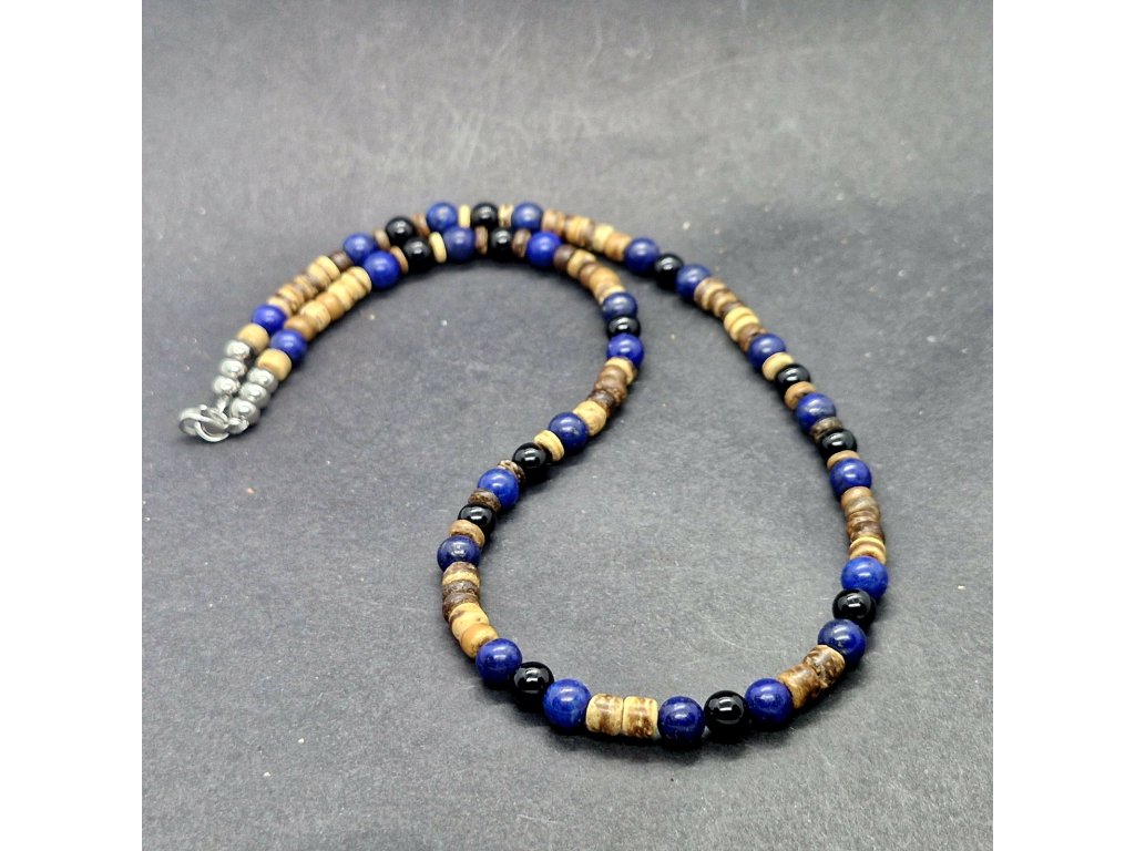 V dokonalé harmonii barev...Pánský náhrdelník vytvořený z kokosových disků, lapis lazuli a onyxu, přináší jedinečný styl a eleganci.