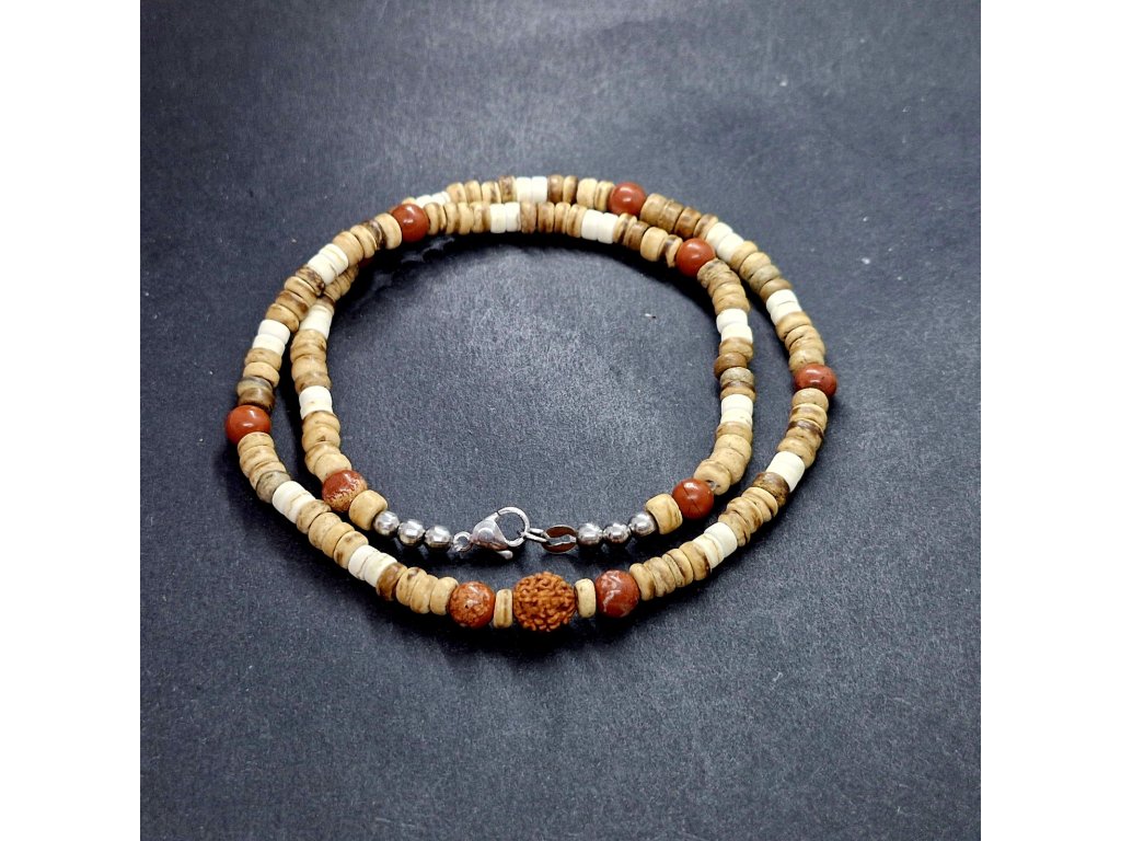 Základ tvoří disky z kokosového dřeva, doplněné o jaspis pro podporu odvahy, howlit pro vnitřní klid a rudrakshu jako symbol ochrany. Jednoduchý, ale výrazný doplněk, který se hodí pro každodenní nošení.