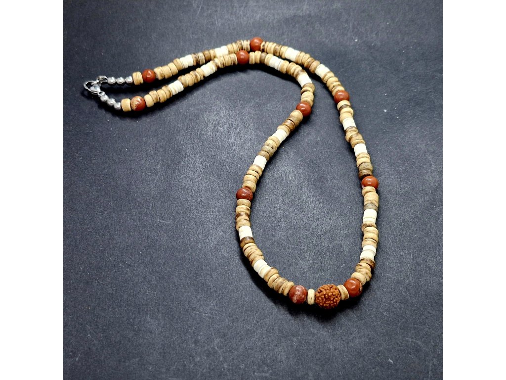 Pánský náhrdelník z kokosového dřeva s obsidiánem a jaspisem.