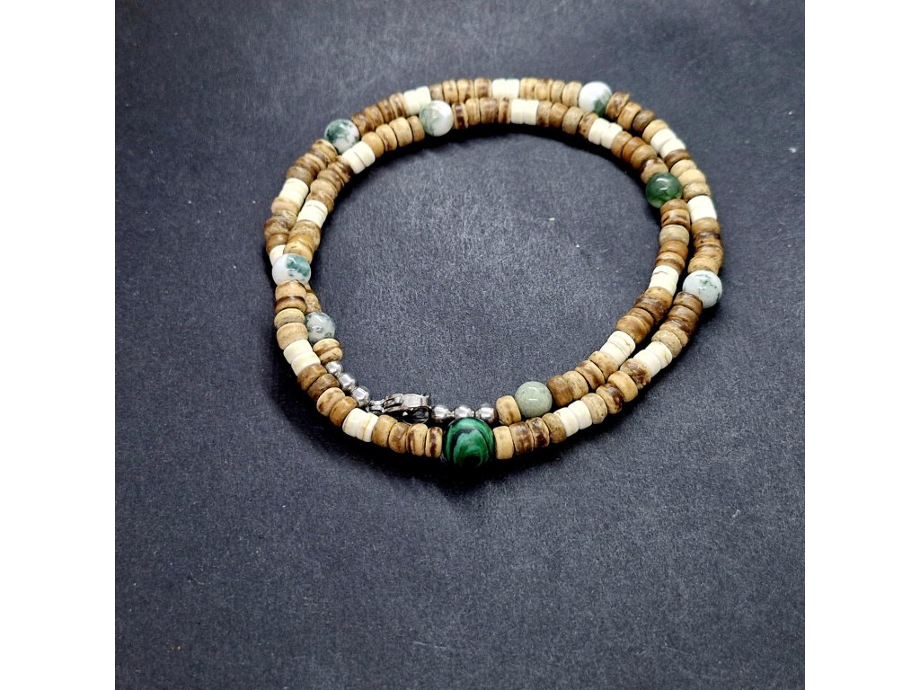 Základ z hřejivého kokosového dřeva doplňují kameny, které v sobě nesou sílu přírody. Stromový achát vás ukotví a dodá odvahu, zatímco bílý howlit přinese do vaší mysli klid a harmonii. Zelený malachit pak symbolizuje vnitřní sílu a ochranu na vaší cestě.