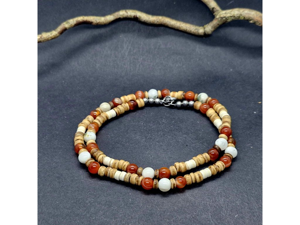 - Karneol: Výrazné korálky z karneolu přinášejí do designu syté, zemité tóny oranžovo-červené barvy. Karneol je tradičně kamenem vitality, odvahy a motivace. Dodává energii a pomáhá při rozhodování.