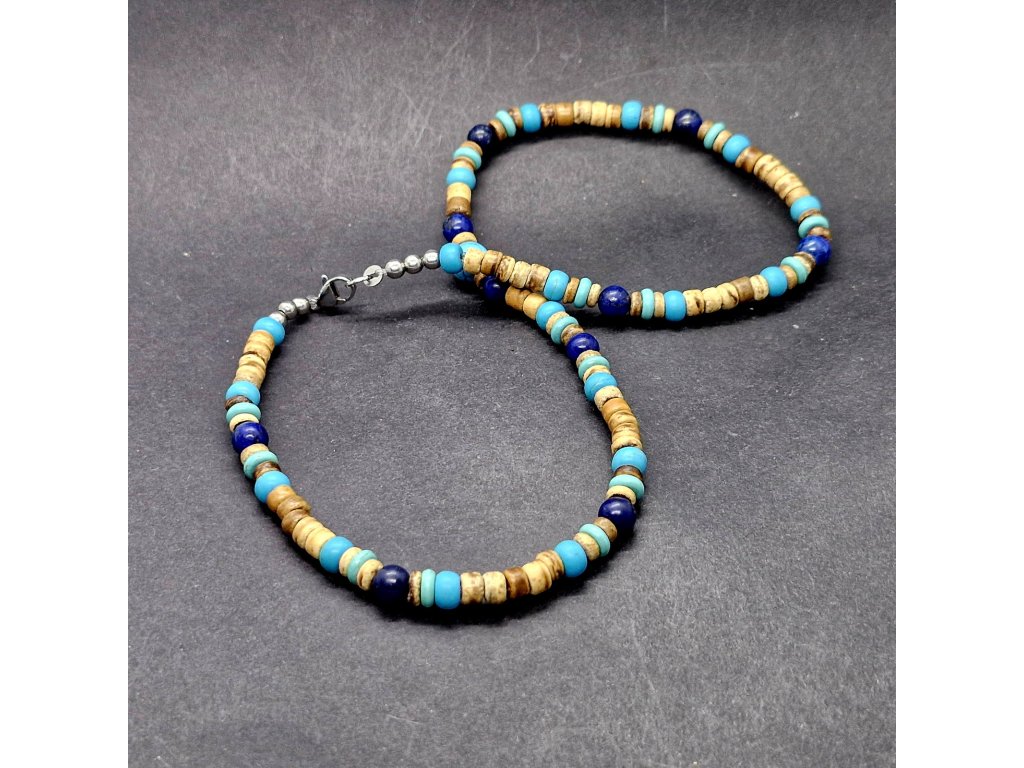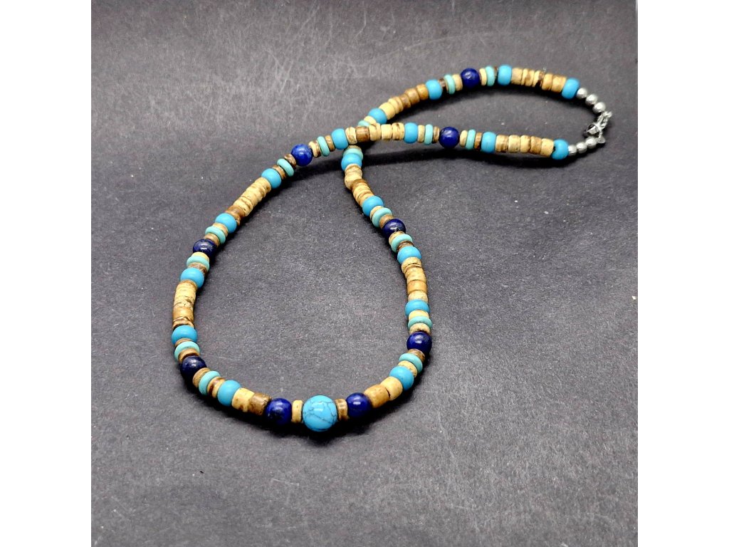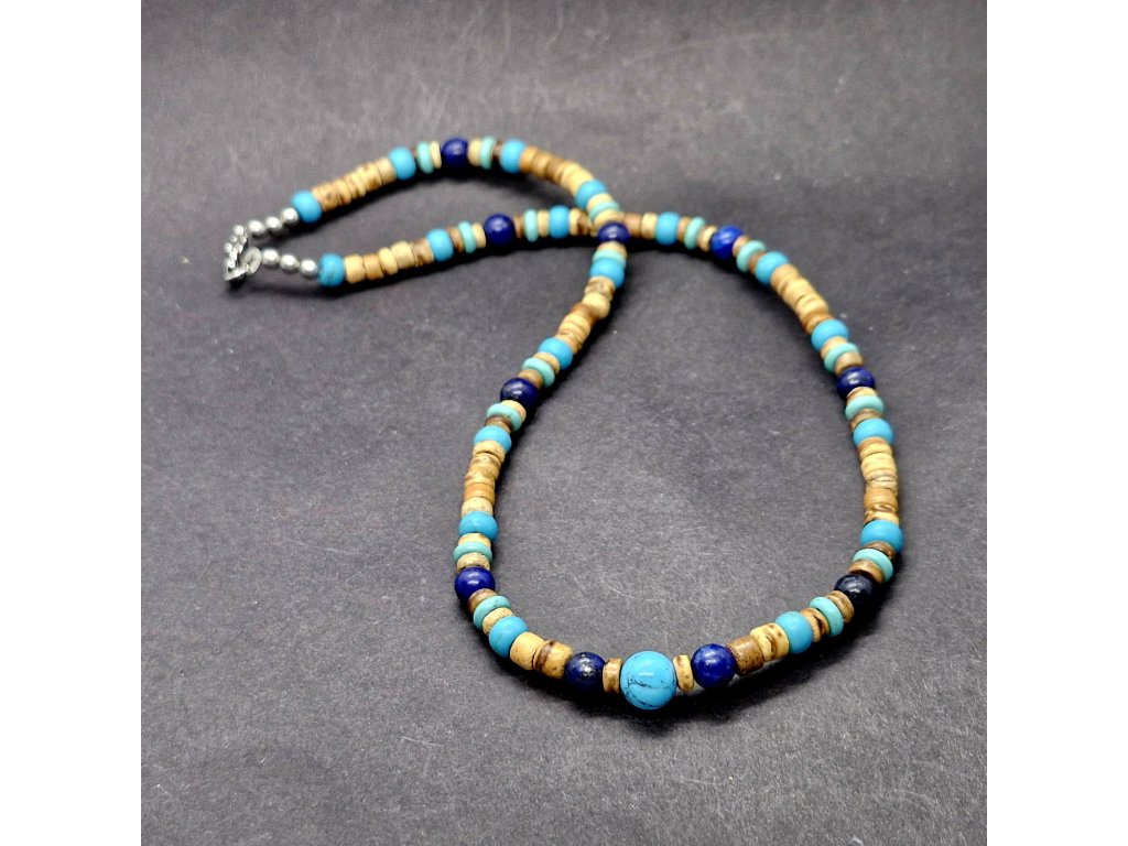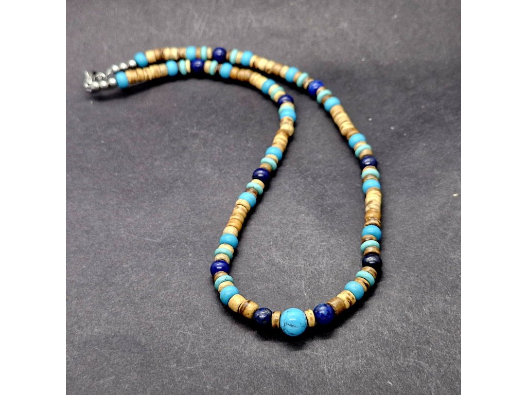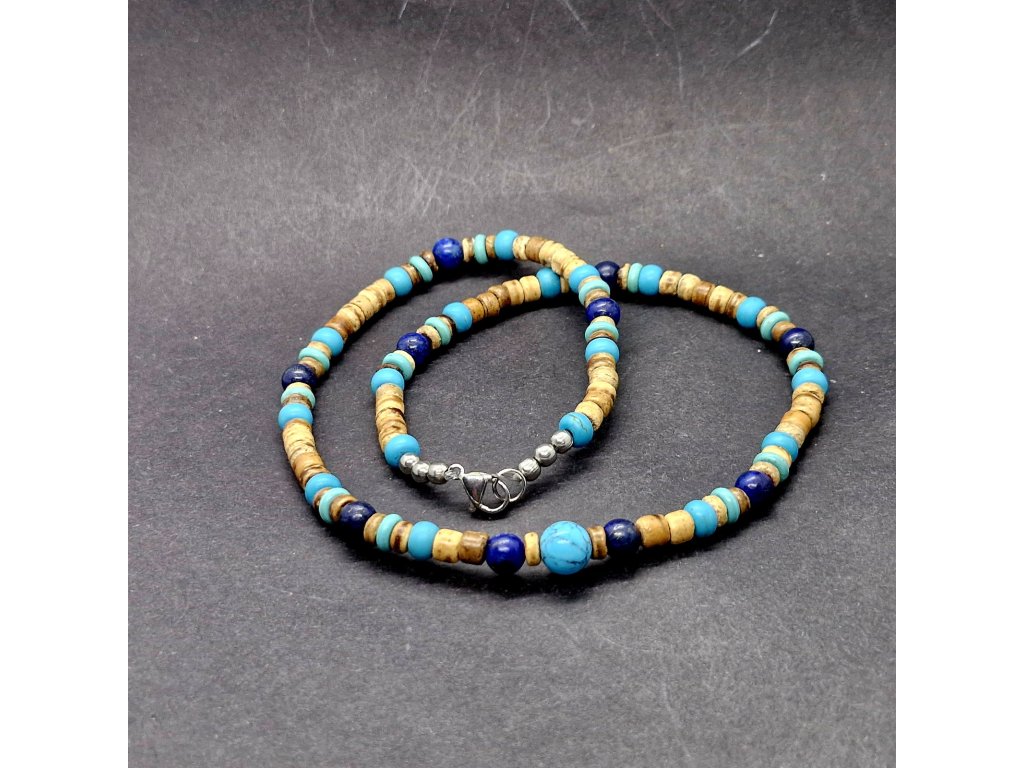 Harmonie přírody a barev...Pánský náhrdelník z kokosových disků, tyrkenitu a lapis lazuli, navržený s důrazem na jedinečnost.