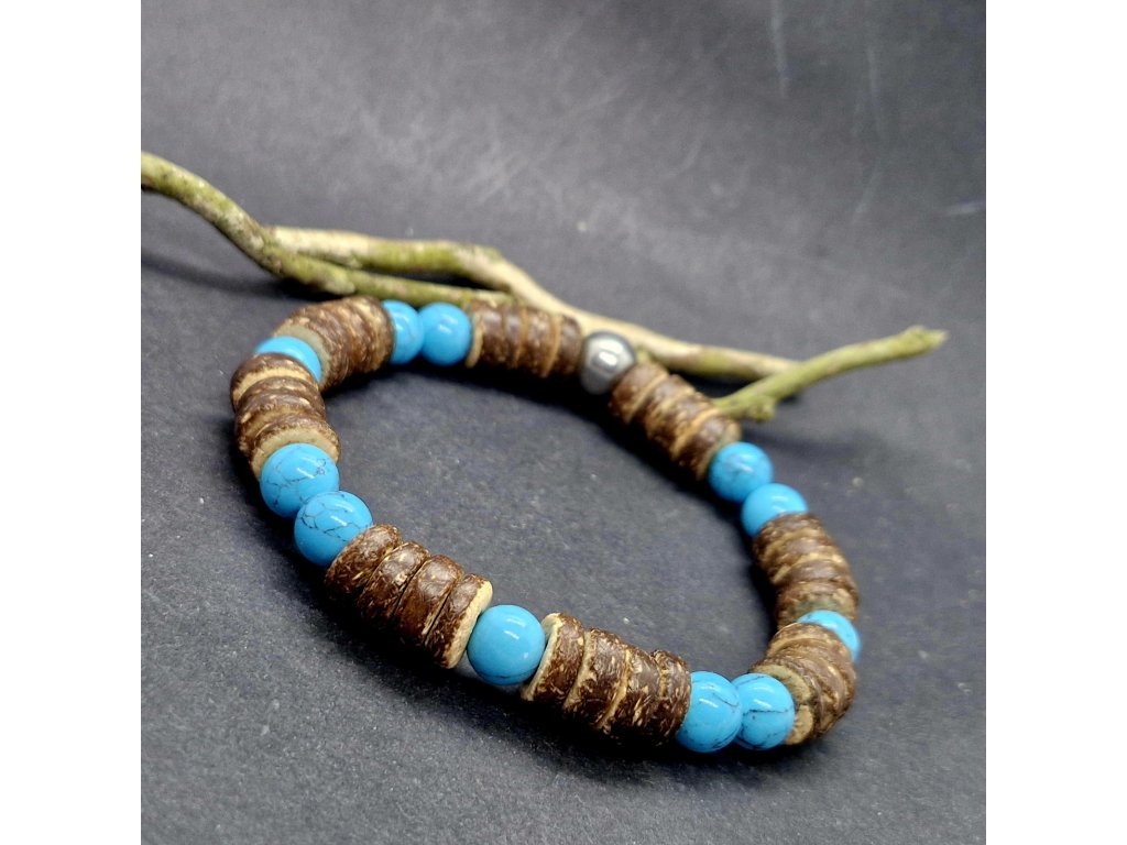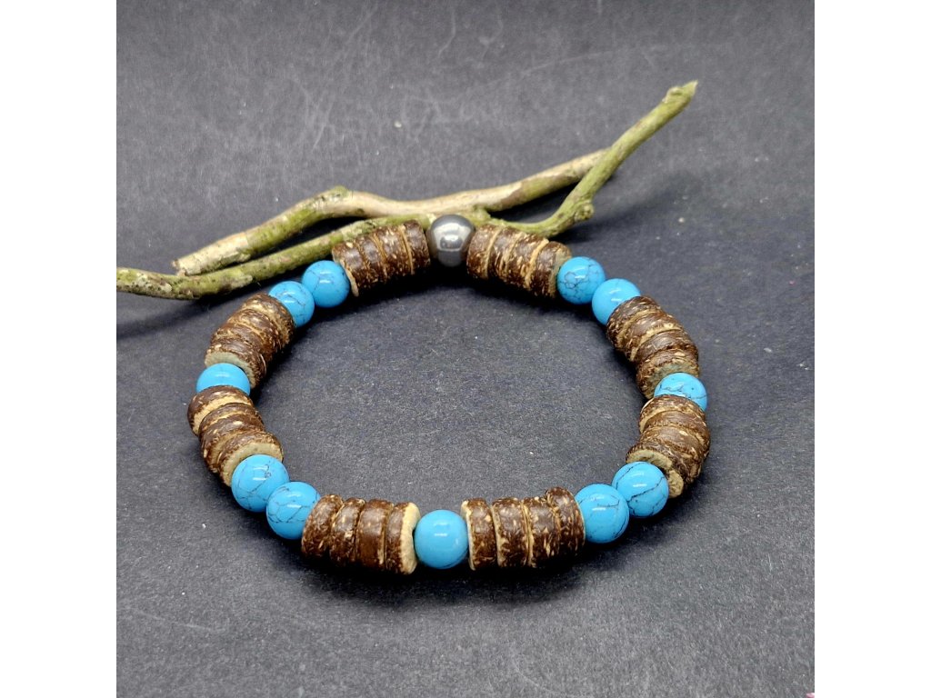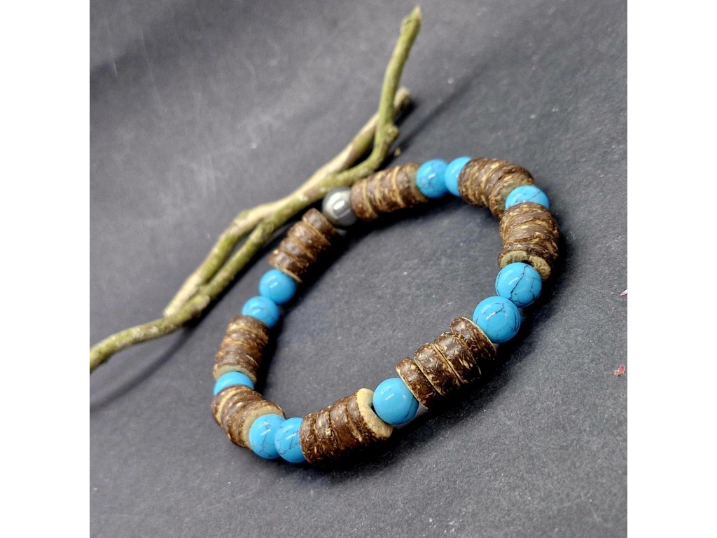 V dokonalé harmonii přírodního dřeva a minerálu. Elegantní pánský náramek s výrazným charakterem. Kombinuje nádherné disky z kokosového dřeva a tyrkenit.