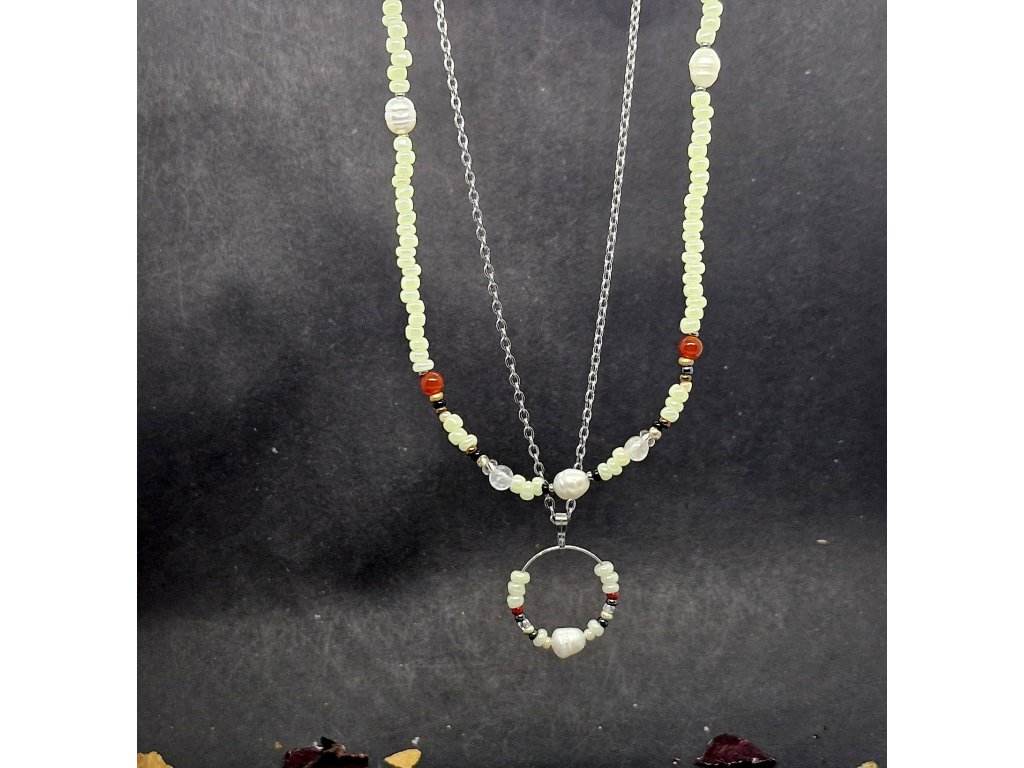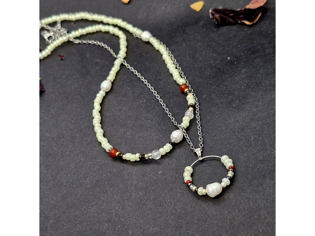 Rozměry: Délka kratšího náhrdelníku 41 cm. Rokajl 2 - 4 mm. Karneol a růženín 4 mm. Perly cca 5 - 6 mm. Zapínání je na karabinku z kvalitní nerezové oceli. Řetízek s přívěskem 45 cm. Průměr kroužku 2 cm.