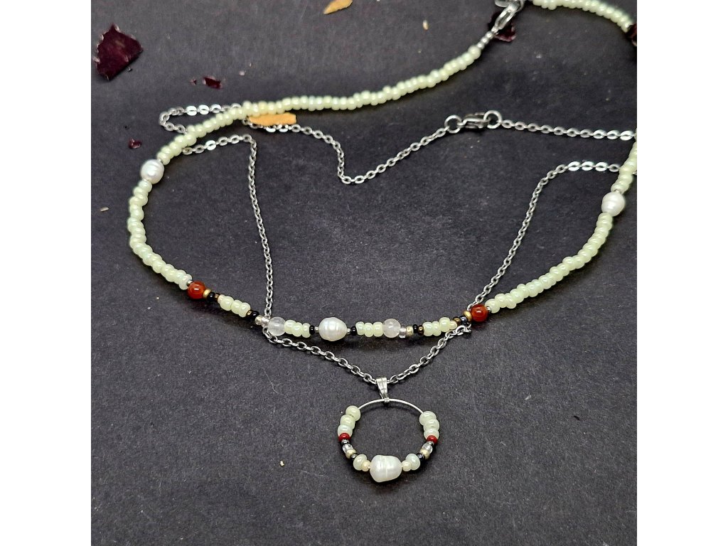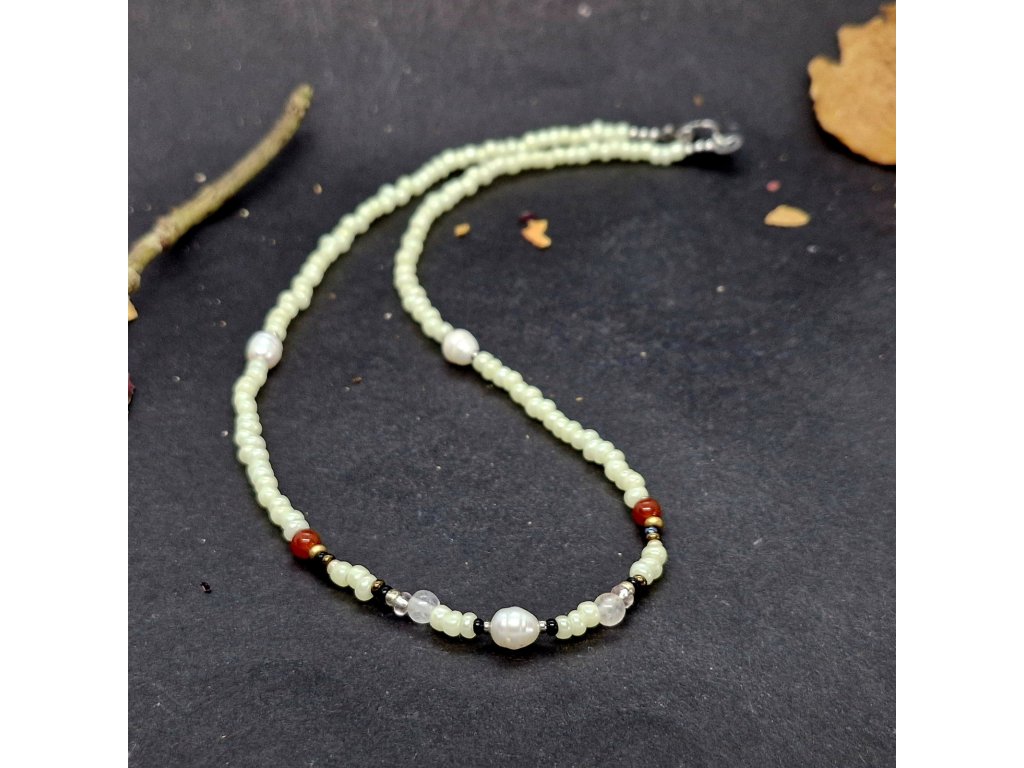 Kratší náhrdelník je z rokajlu, karneolu, růženínu a sladkovodních perel.
